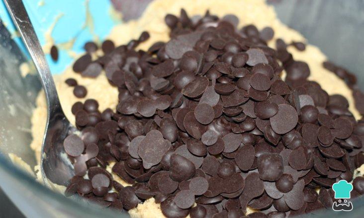 Añadimos los chips de chocolate al bol con la masa y mezclamos con las manos. Si quieres agregar nueces troceadas, ahora es el momento. Precalentamos el horno a 180ºC.