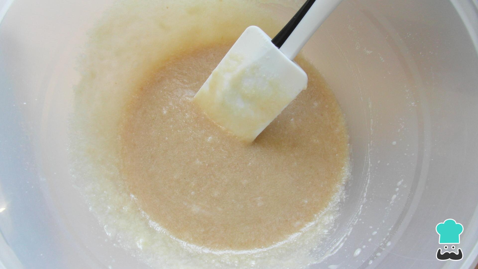 Luego mezcla en un bol el azúcar con el almidón de maíz, y añade el aceite de coco, que en este caso, es el sustituto de los productos lácteos que esta receta llevaría si no fuera sin lactosa. Mézclalo todo muy bien.