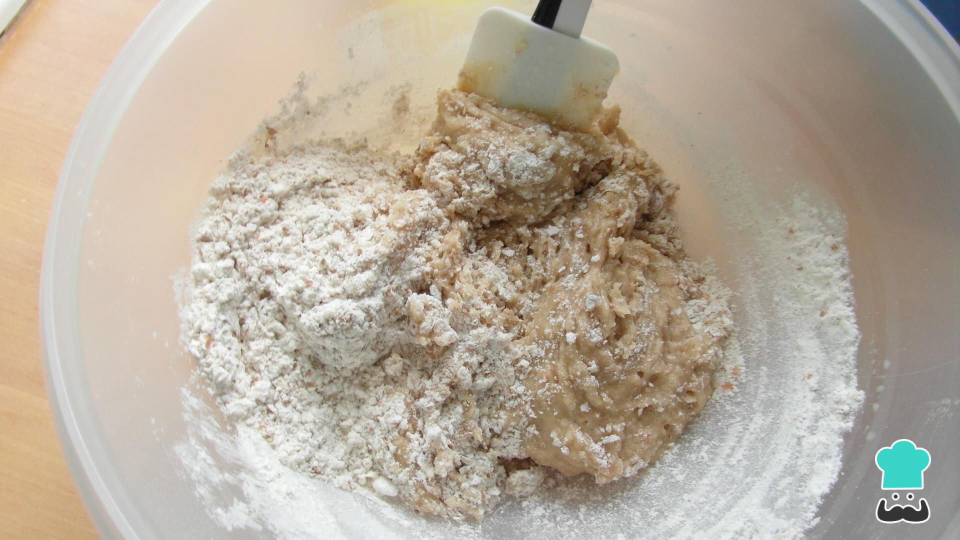 El siguiente paso para preparar estas galletas es añadir la harina de trigo, la levadura, el bicarbonato y la sal, y mezclarlo todo muy bien. Si quieres, puedes utilizar una mezcla de harina de trigo blanca y harina de trigo integral con el fin de hacer estas galletas un poco más saludables.
