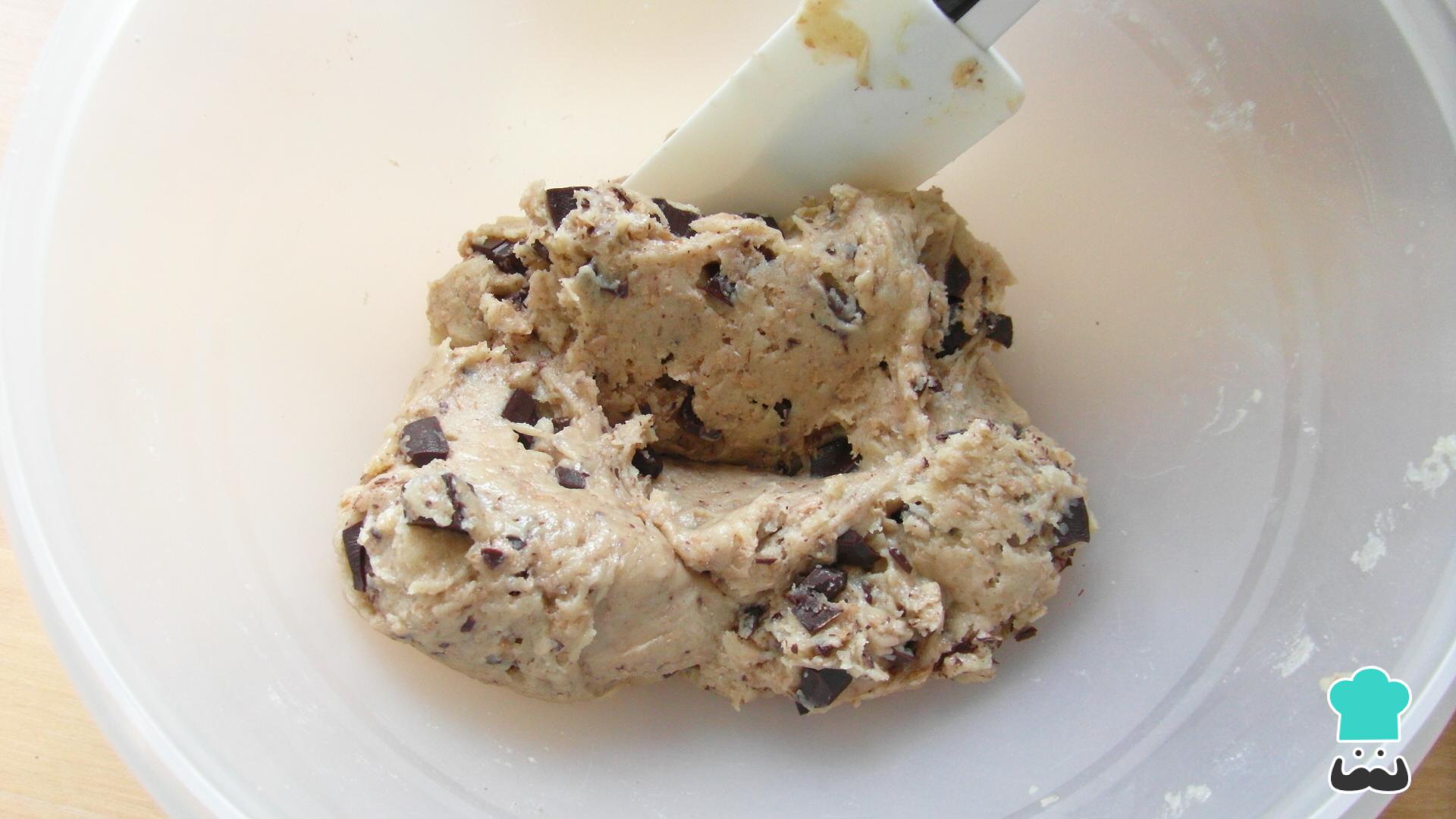 Cuando los ingredientes anteriores estén perfectamente incorporados y tengas una masa compacta, agrega las chispas de chocolate y remuévelo todo bien.