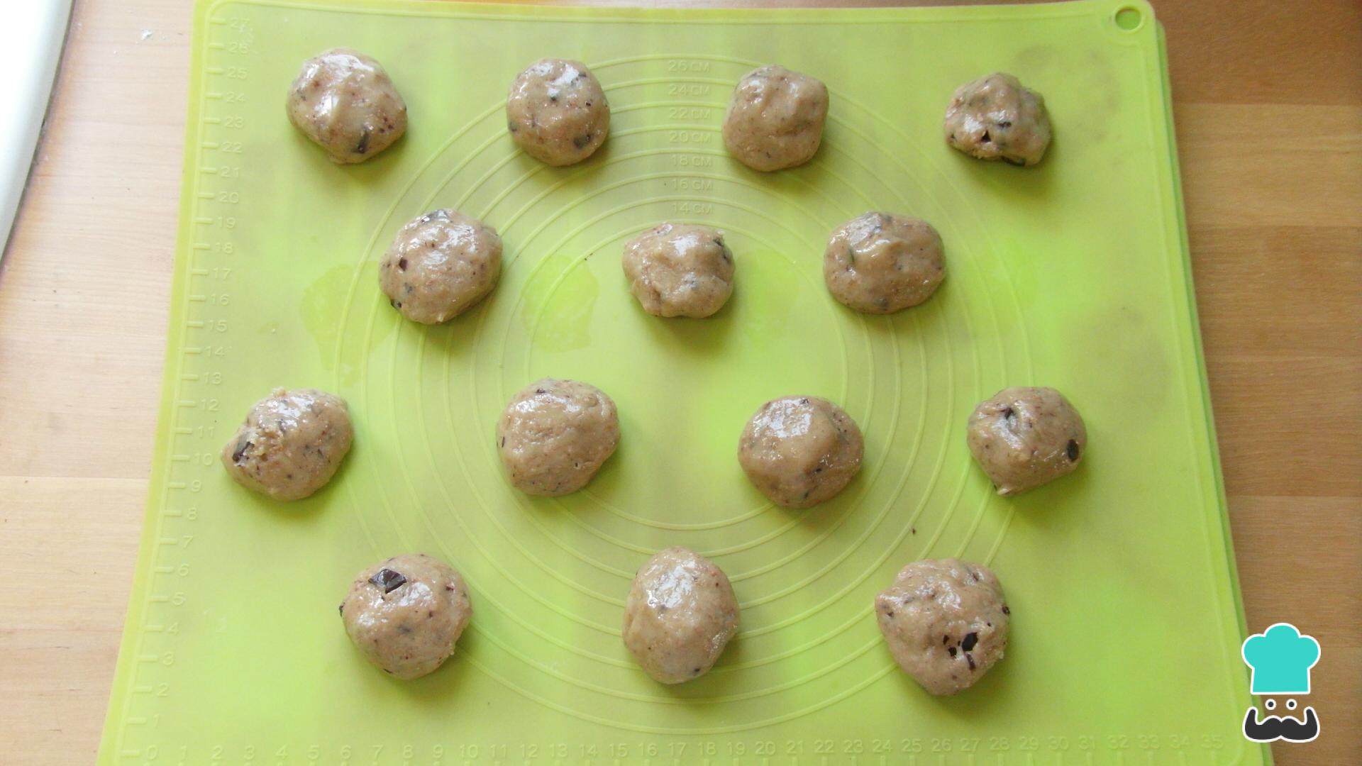 Con las manos untadas en un poco de aceite para que te sea más fácil moldearlas, formatea la masa de las galletas con chispas de chocolate sin lactosa en pequeñas bolitas, y colócalas en un silpat de silicona o sobre un papel de horno para que no se peguen.