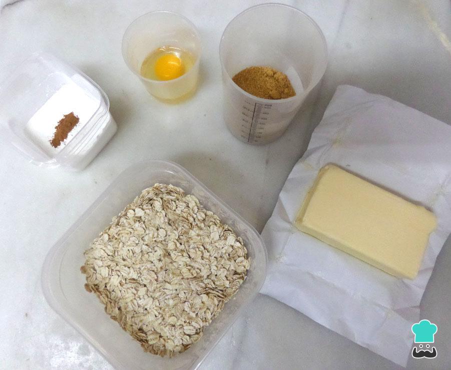 Antes de comenzar a preparar las galletas de avena caseras, es aconsejable ordenar tu mesa de trabajo. Coloca los ingredientes y utensilios necesarios.