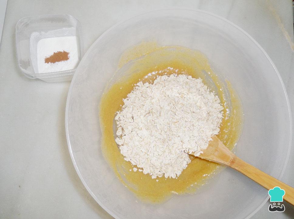 Para terminar con la masa de nuestras galletas de avena, agrega el resto de los ingredientes: la avena, la canela, la harina, la levadura y la sal. Mezcla todo hasta que se forme una masa uniforme.