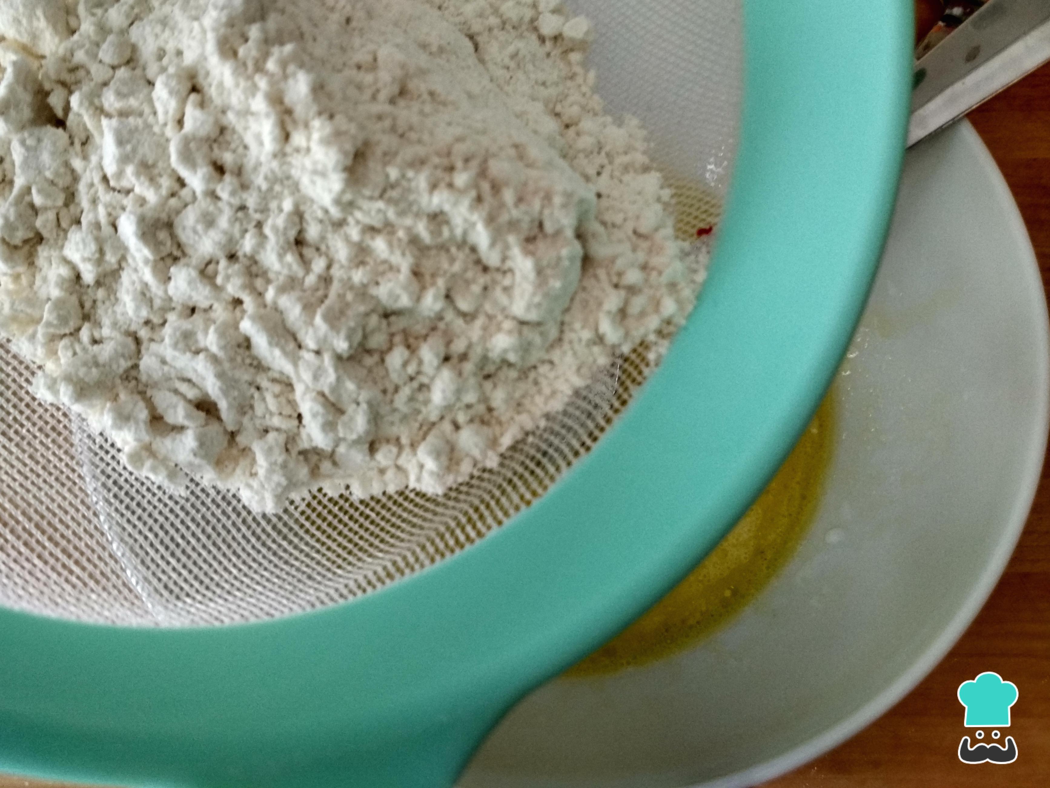 Tamizamos y añadimos los ingredientes secos, la harina, sal y levadura poco a poco. Empezamos mezclando con un tenedor y cuando la masa empiece a espesar demasiado, seguimos con las manos y pasamos la masa a una tabla.
