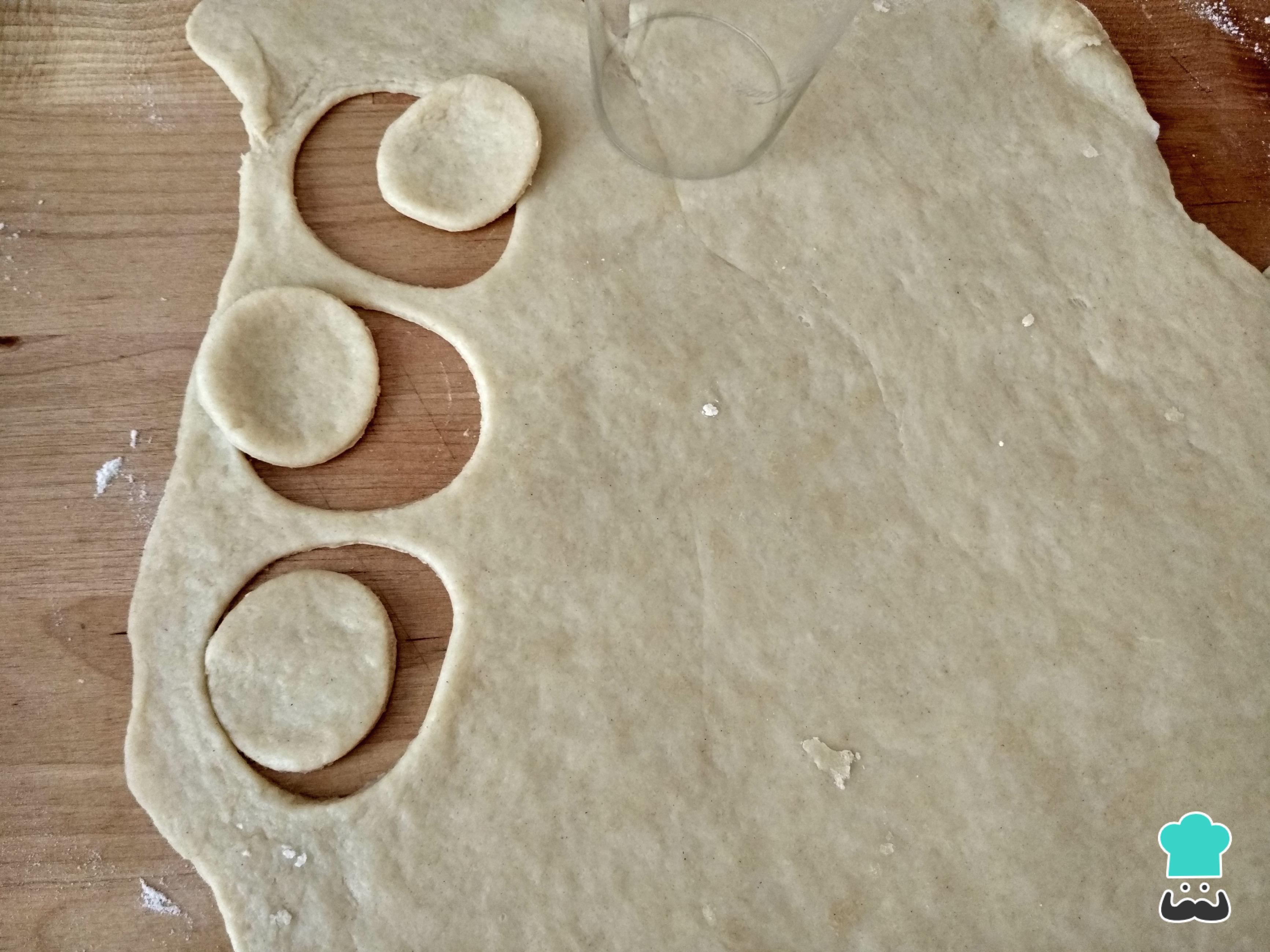 Cortamos la masa para galletas con cualquier molde circular que tengamos, si es de tamaño pequeño, mejor. Colocamos las galletas saladas en una bandeja para horno forrada con papel antiadherente y ponemos el horno a precalentar a 180 ºC.