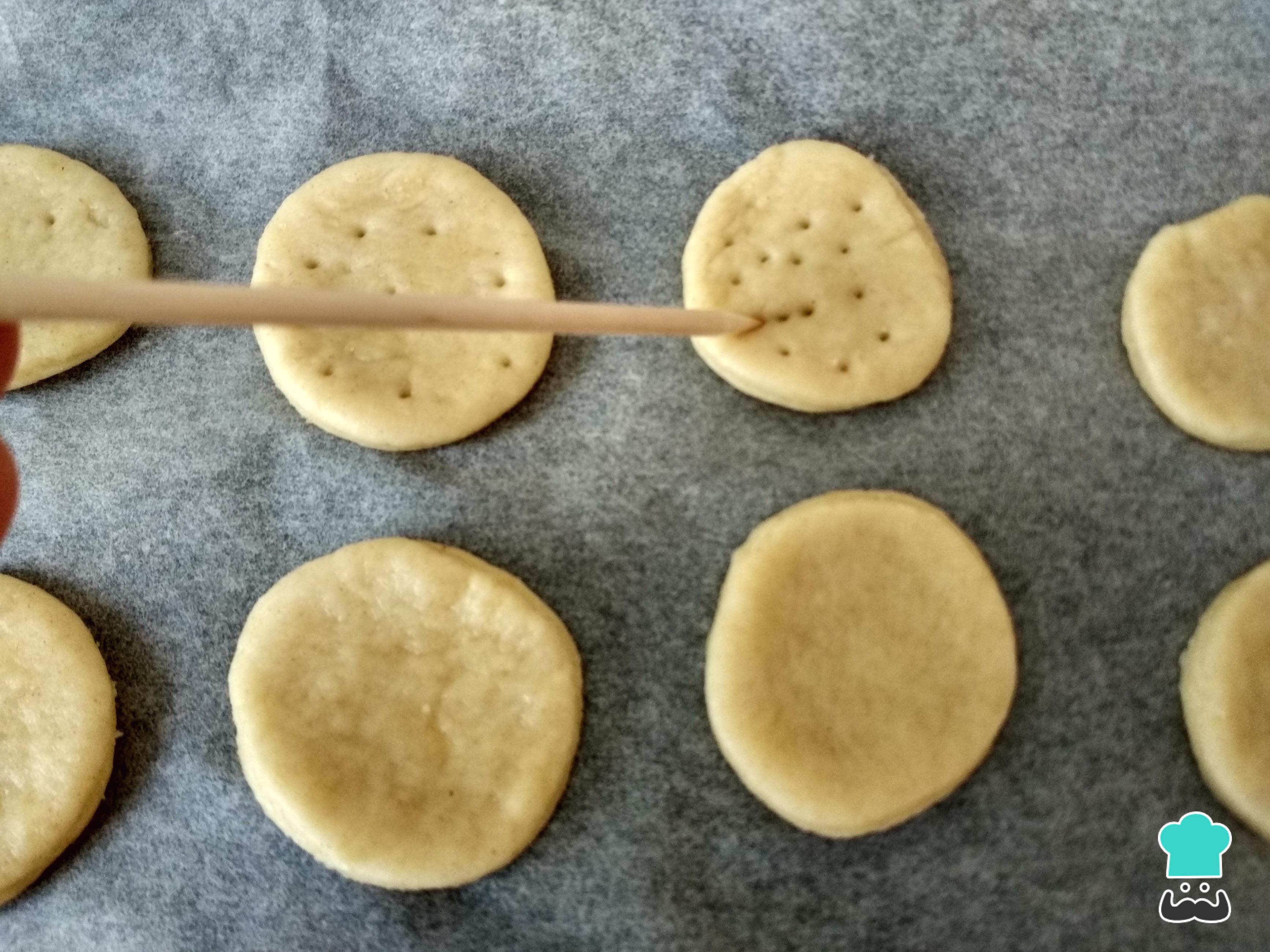 Pinchamos las galletas de aceite saladas con un palito para que no suban al hornearse, tal y como se ve en la imagen. Metemos las galletas saladas al hornoy cocinamos a 180 ºC durante 15-18 minutos, hasta que empiecen a dorarse.