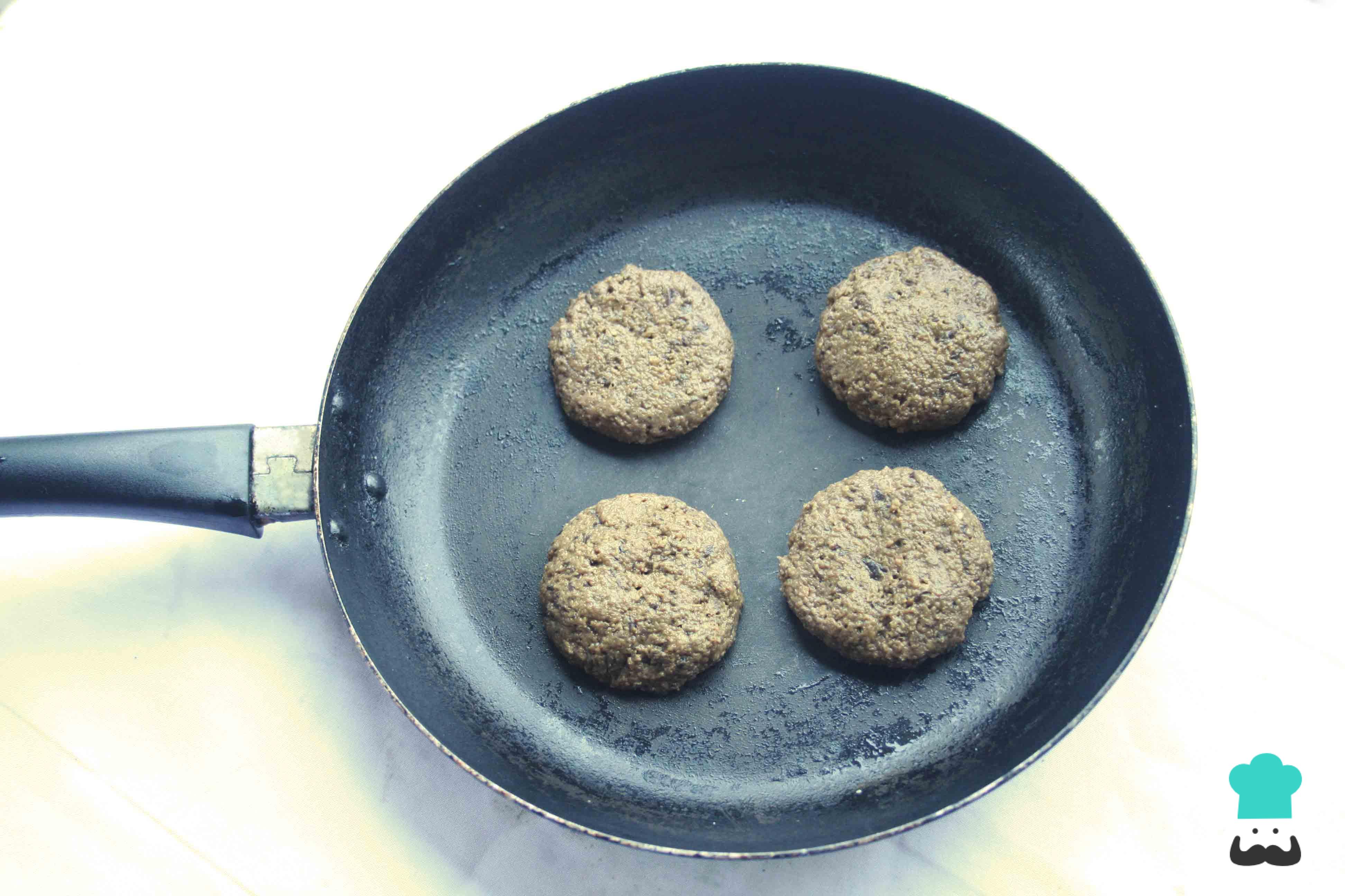 Engrasa una sartén (preferiblemente antiadherente), humedeciendo una servilleta con mantequilla o aceite vegetal. Si posees papel de hornear, unta de la misma manera la grasa y coloca el papel encima. Precalienta un par de minutos la sártén y, mientras tanto, prepara las galletas haciendo bolitas con las manos y aplastándolas un poco. Si la masa está muy pegajosa, utiliza dos cucharas para darles forma y deposita en la sartén. Cubre el recipiente con una tapa o papel de aluminio y procura que quede herméticamente cerrado.