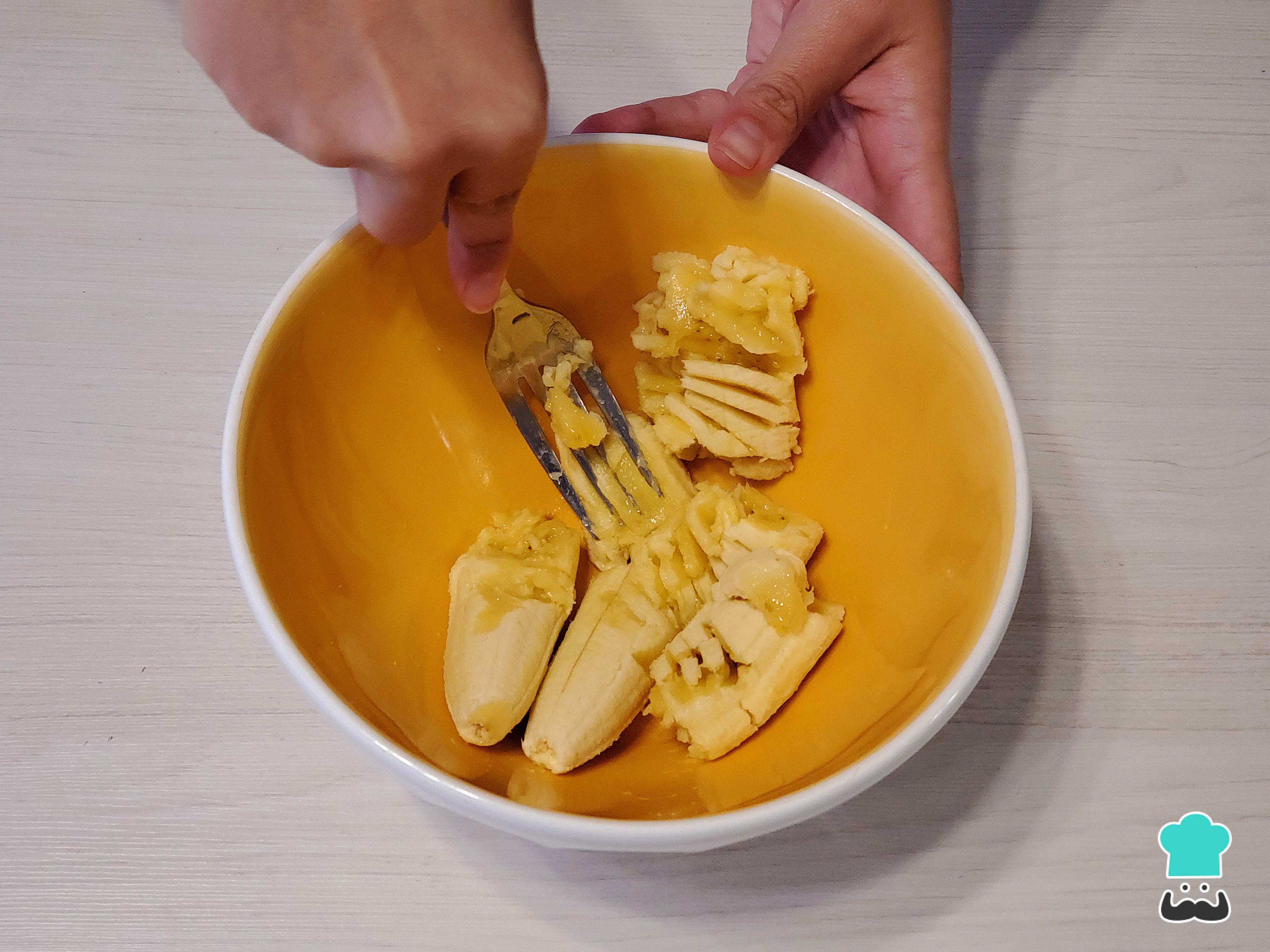 Empieza lavando y pelando los plátanos. A continuación, colócalos dentro de un bowl grande y, con ayuda de un tenedor, aplástalos hasta que se forme una compota. No te preocupes si quedan pequeños trozos de fruta sin deshacer porque durante el horneado serán imperceptibles.