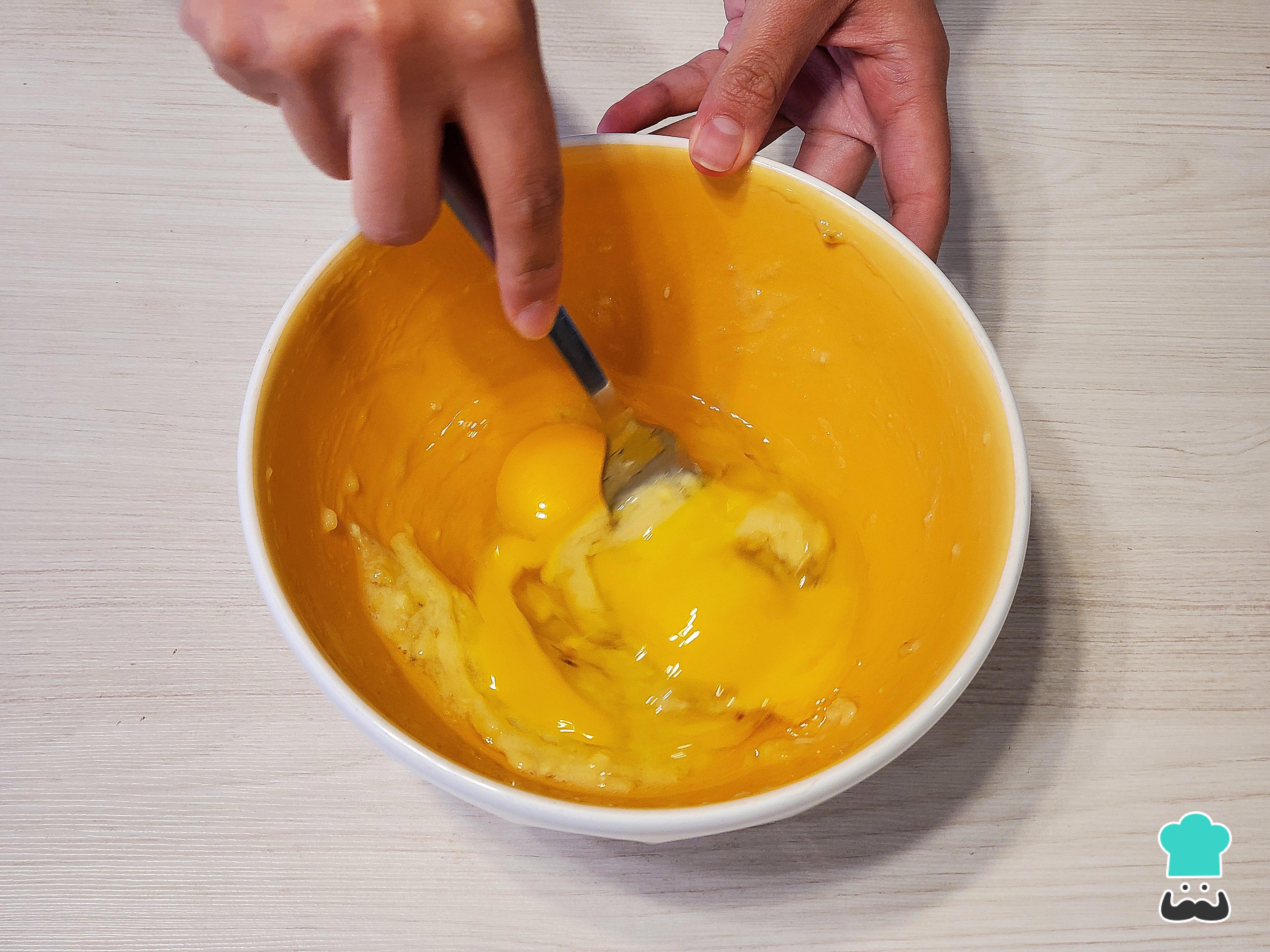 Vierte los huevos y mezcla bien, sigue utilizando el tenedor porque es realmente fácil combinarlos.