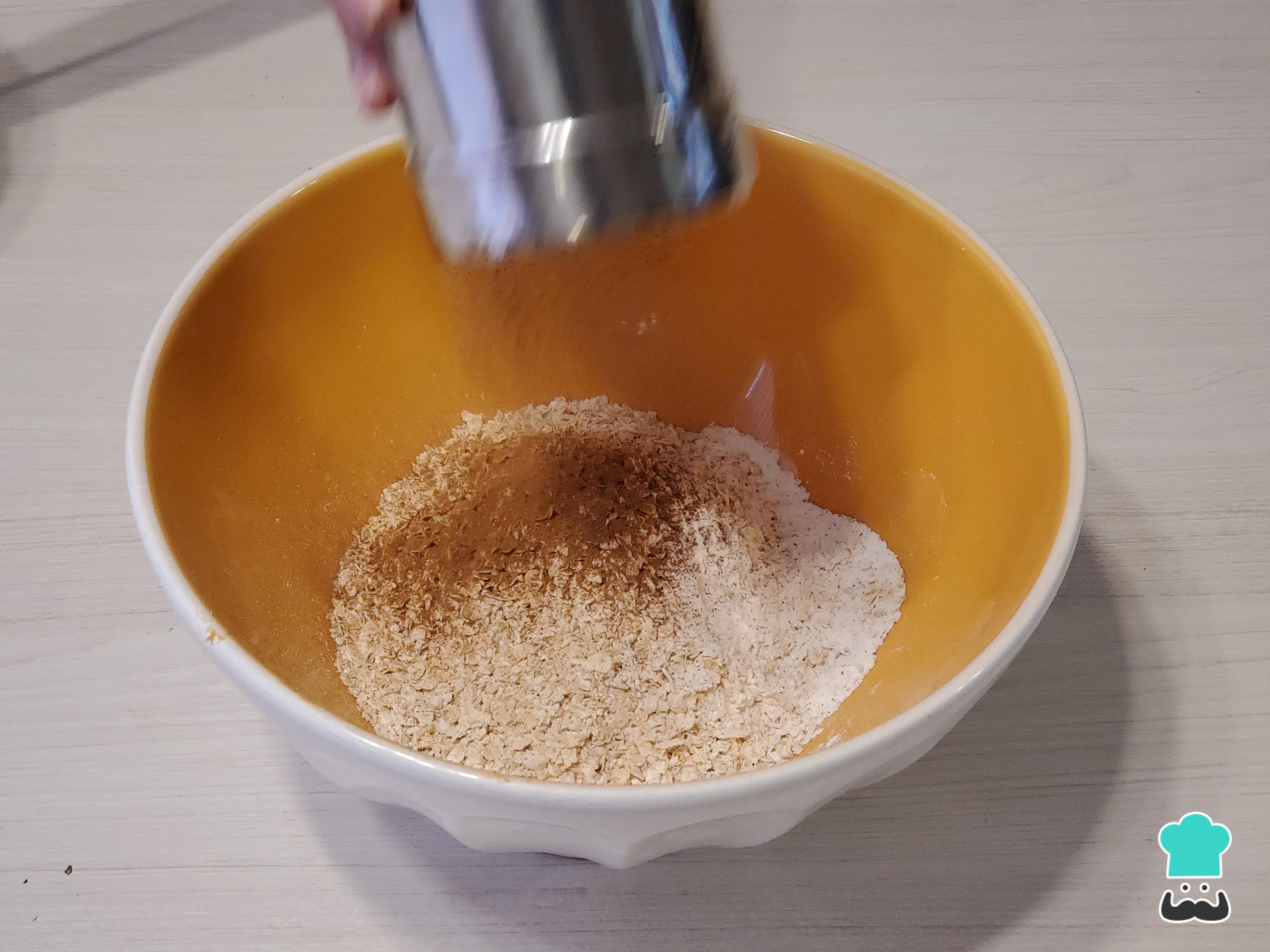 Añade todos los ingredientes secos que son las hojuelas de avena, el polvo de hornear y, si te gustan las especias, agrega canela en polvo, nuez moscada molida, kion en polvo, entre otros.