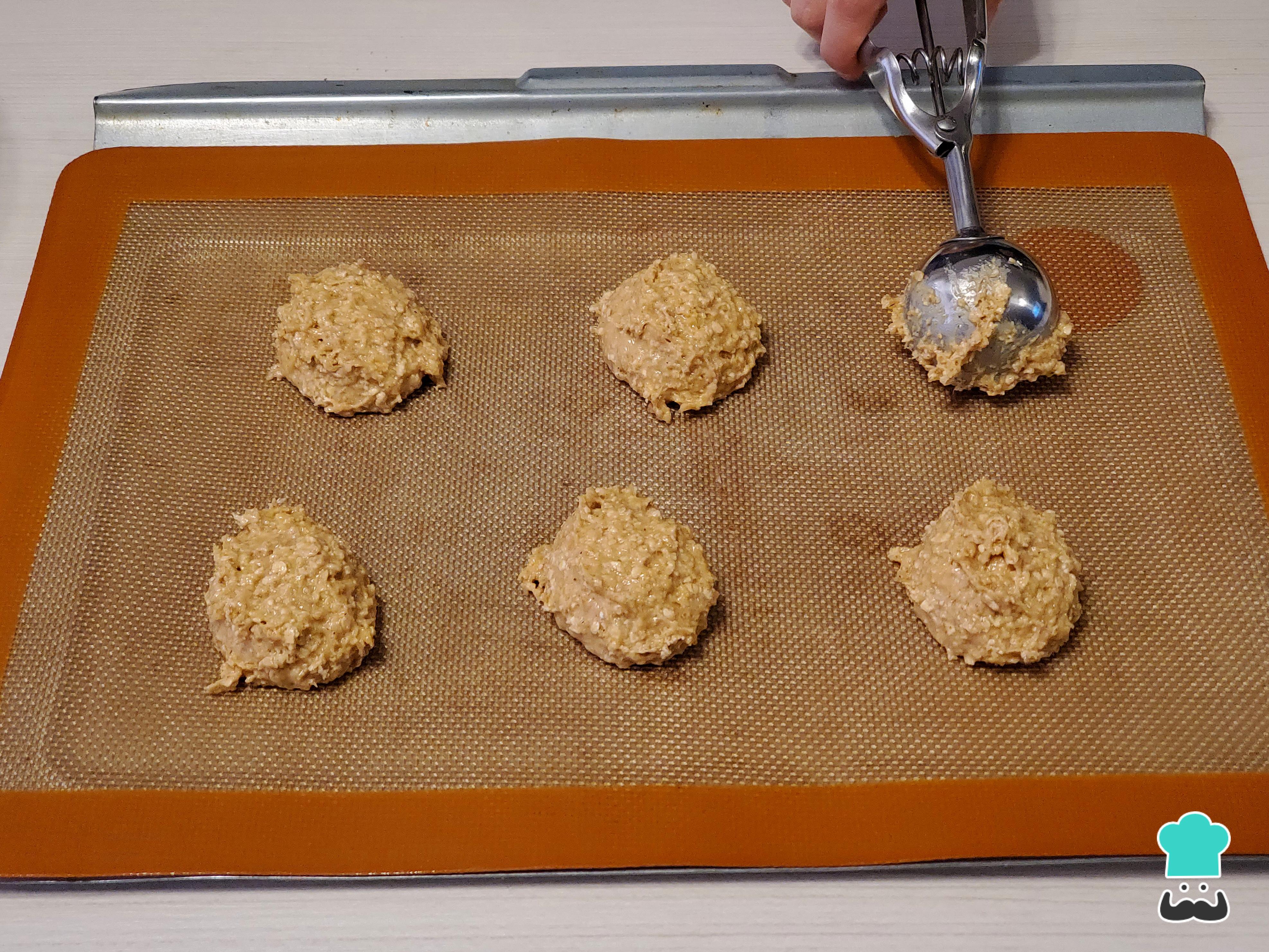 Finalmente, divide la masa en bolas de 50 a 60 gramos cada una o utiliza una cuchara de helado para porcionarla. No te preocupes si las bolitas no tienen una forma perfecta porque durante el horneado se expandirán y se hincharán. Acomoda cada bolita en una placa con tapete de silicona o una hoja de papel manteca, deja 4 dedos de distancia entre unas y otras.