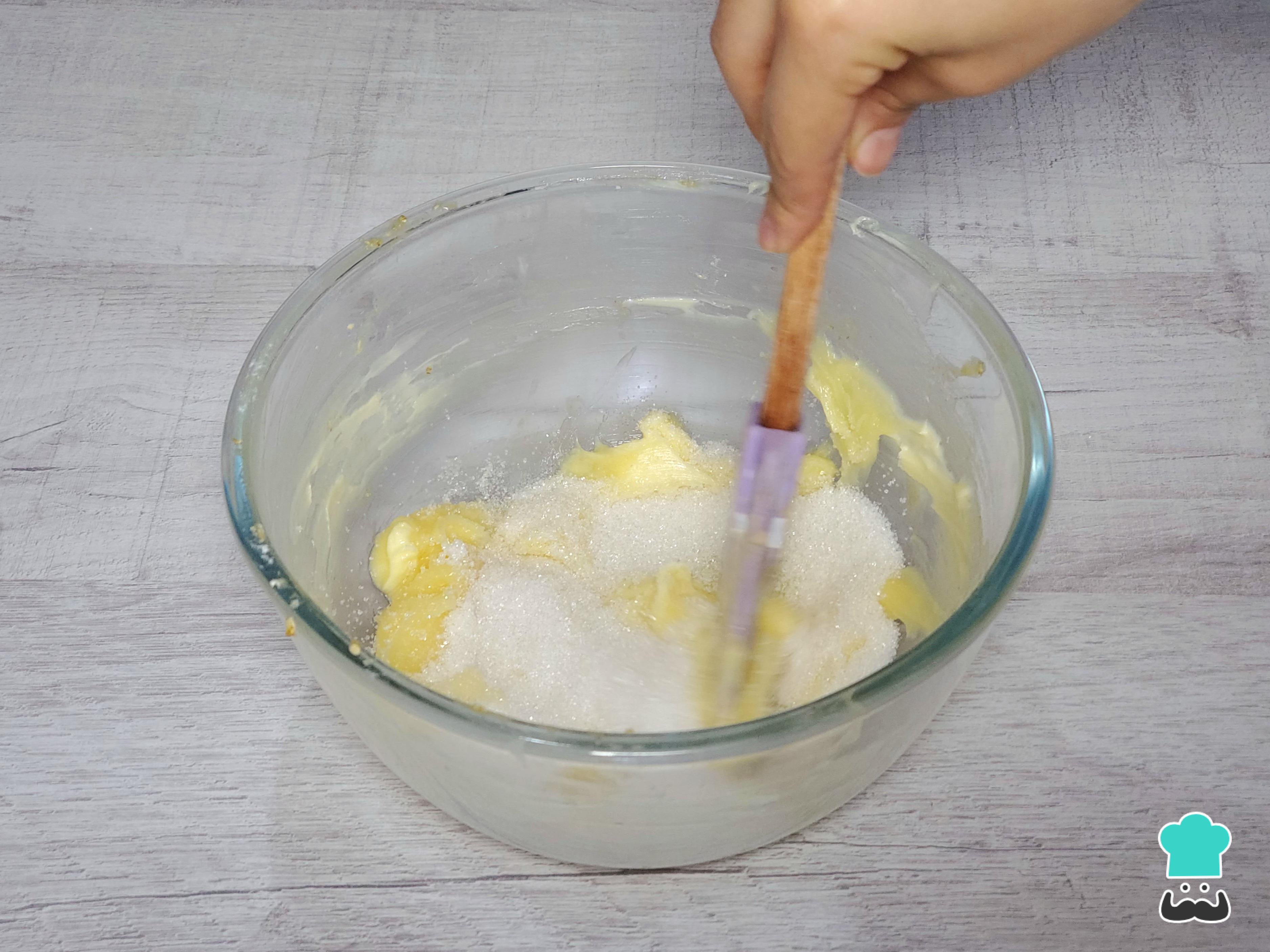 Empieza colocando en un bowl la mantequilla a temperatura ambiente. Incorpora el azúcar granulada y mezcla bien hasta obtener una crema homogénea.