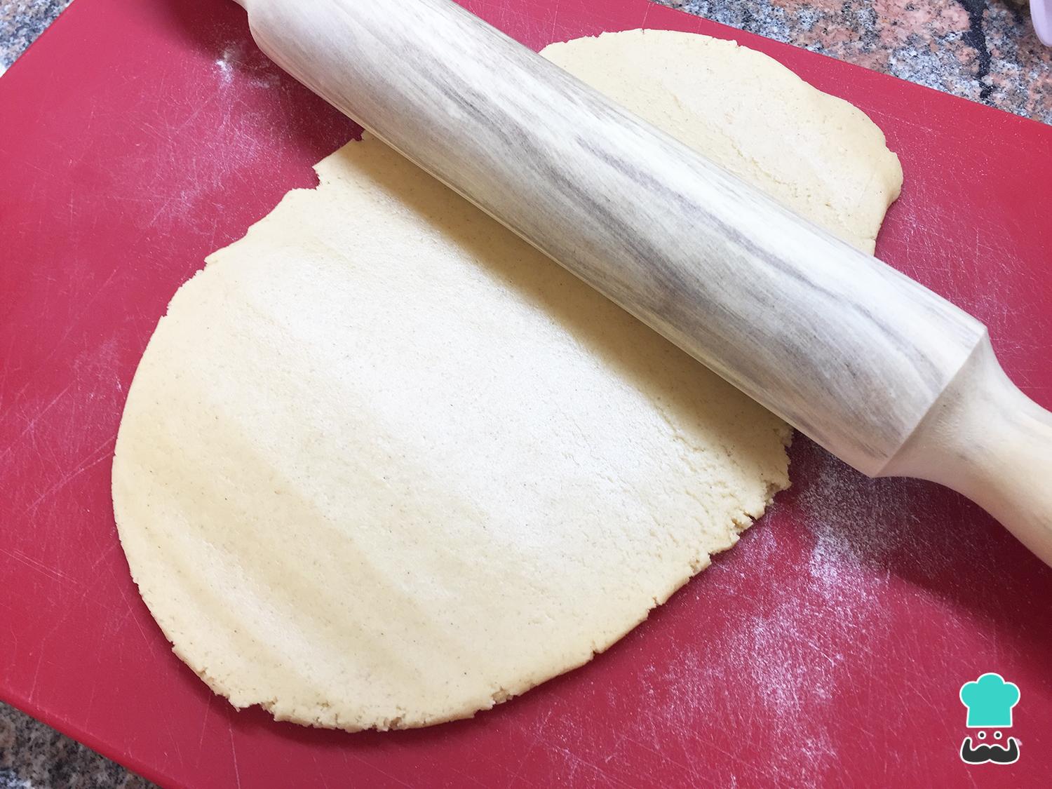 Una vez hayas conseguido una masa homogénea, añade la harina hasta que cueste un poco batirla y saca la masa. Espolvorea harina sobre una superficie para extender la masa sobre ella con ayuda de un rodillo. Corta las galletas con la forma que desees. Puedes hacerlo con una taza si no tienes moldes.