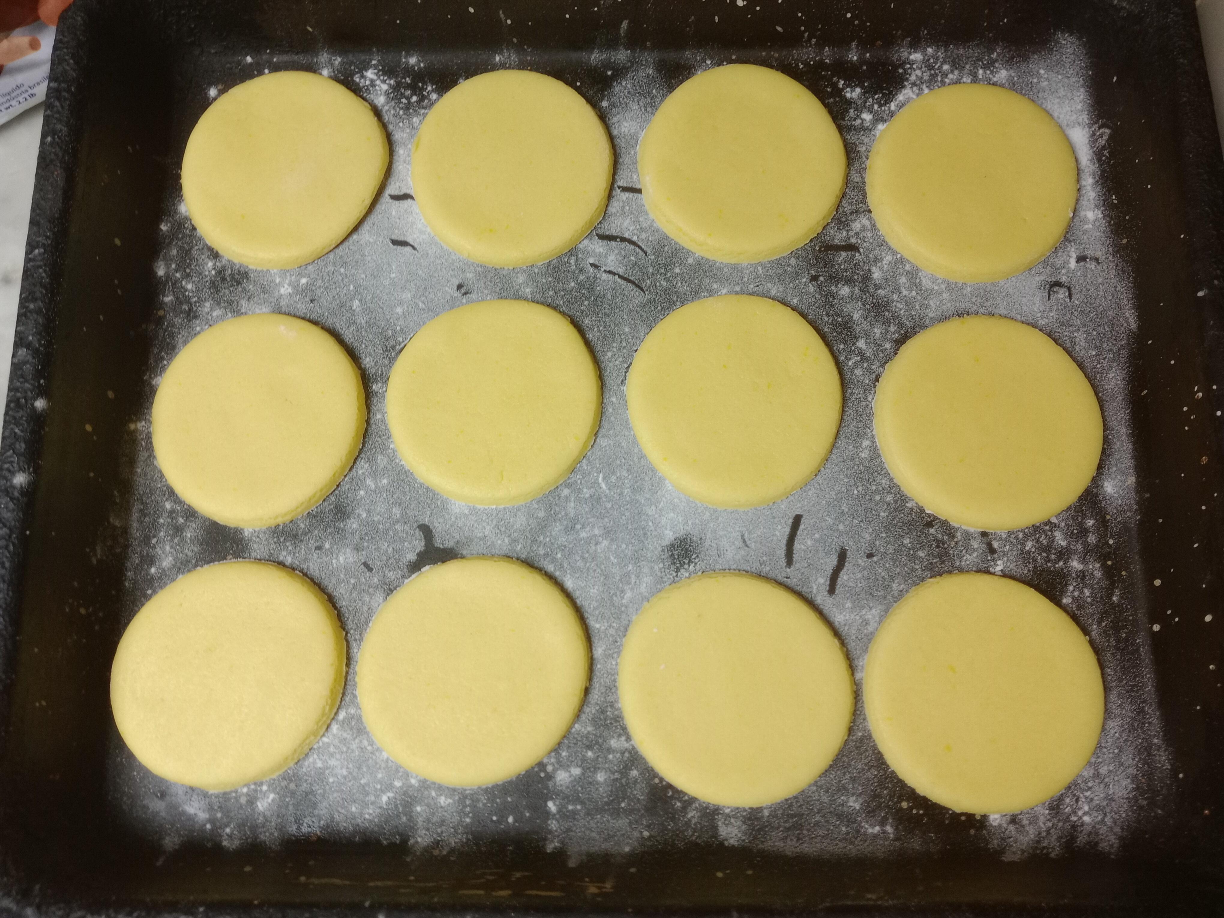 Coloca las galletas sobre una bandeja de horno forrada con papel vegetal y espolvorea un poco de azúcar por encima. Precalienta el horno a 180 ºC con calor arriba y abajo.