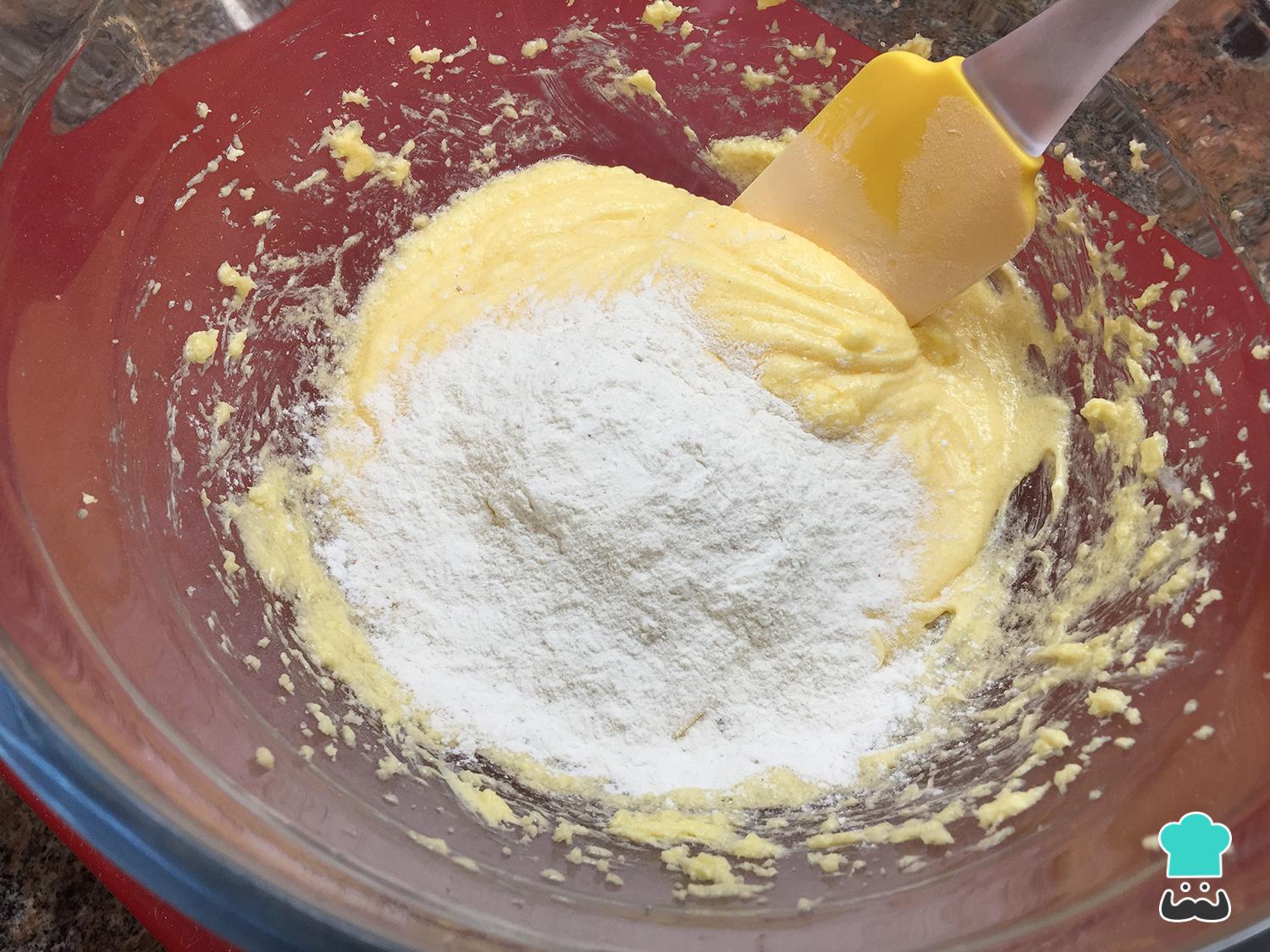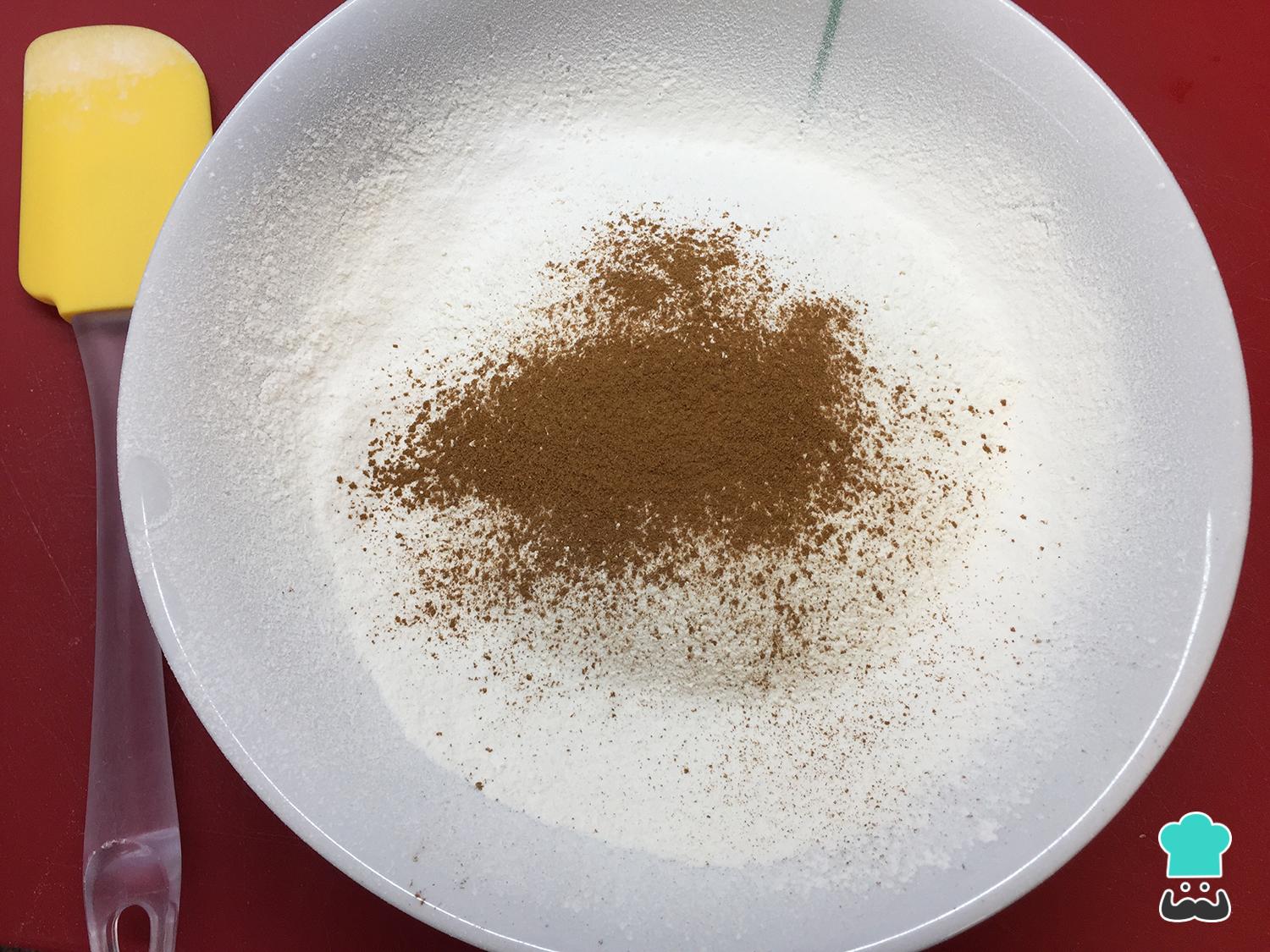Aparte, tamiza la harina con la canela y mezcla ambos ingredientes. Nosotros hemos utilizado harina de repostería, que no es otra que harina de trigo con levadura (polvos de hornear) incluida. Así, si no dispones de este tipo de harina, puedes utilizar harina común y añadir una cucharadita de polvos de hornear.
