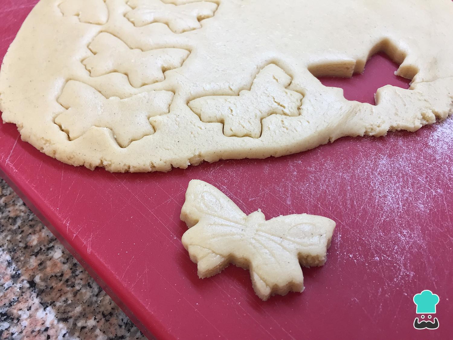 Estira la masa con un rodillo y corta las galletas con el molde que más te guste. Para evitar que la masa de galletas de mantequilla y canela se quede pegada sobre la mesa, espolvorea harina tanto en la superficie como en tus manos y en el rodillo.