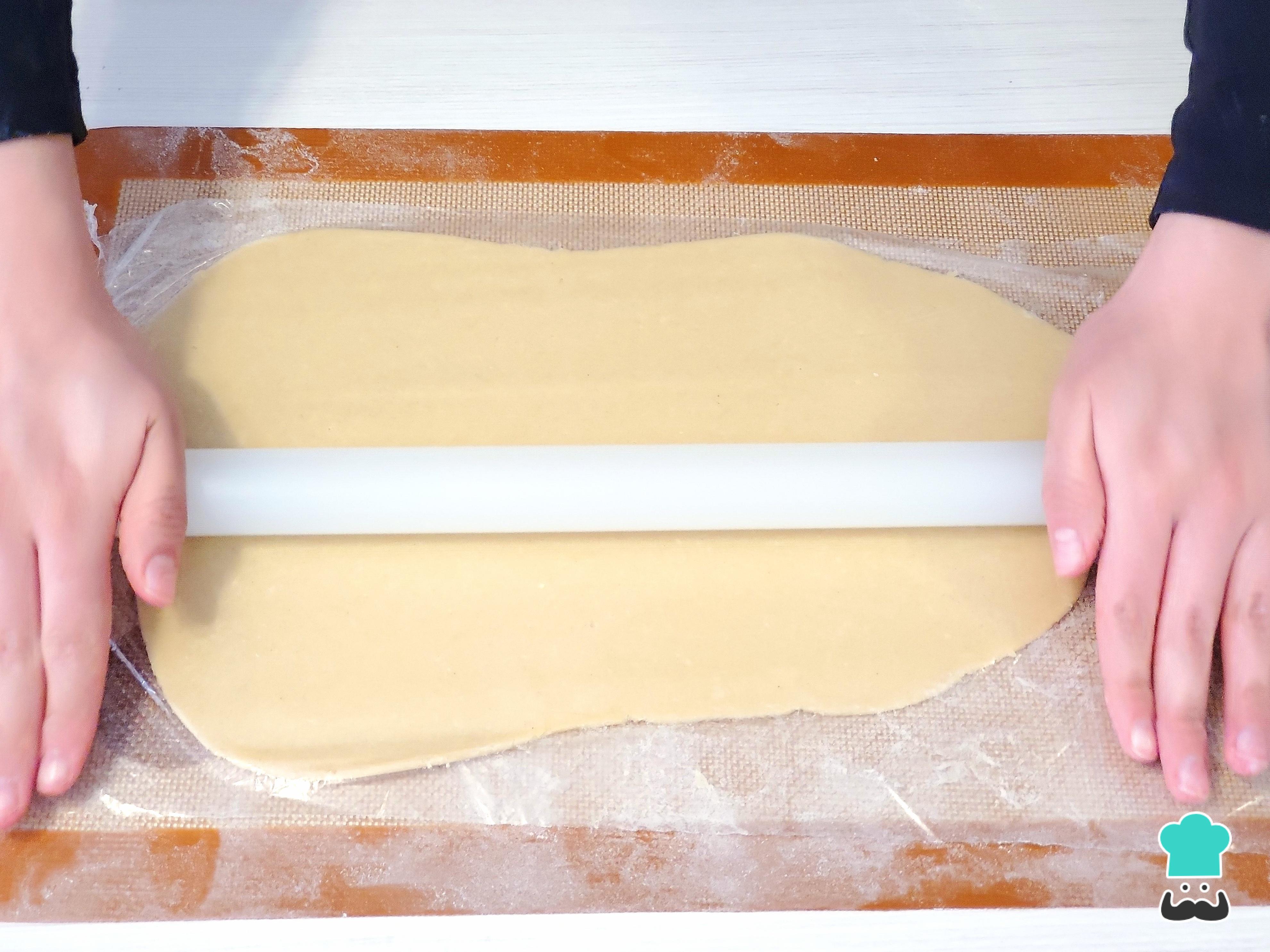 Cumplido el tiempo de reposo, estira la masa entre dos papeles film, tapetes de silicona o papeles manteca, de esta manera, no se agregará más harina a la receta. Cuando la masa tenga alrededor de medio centímetro de grosor, congela hasta endurecer.