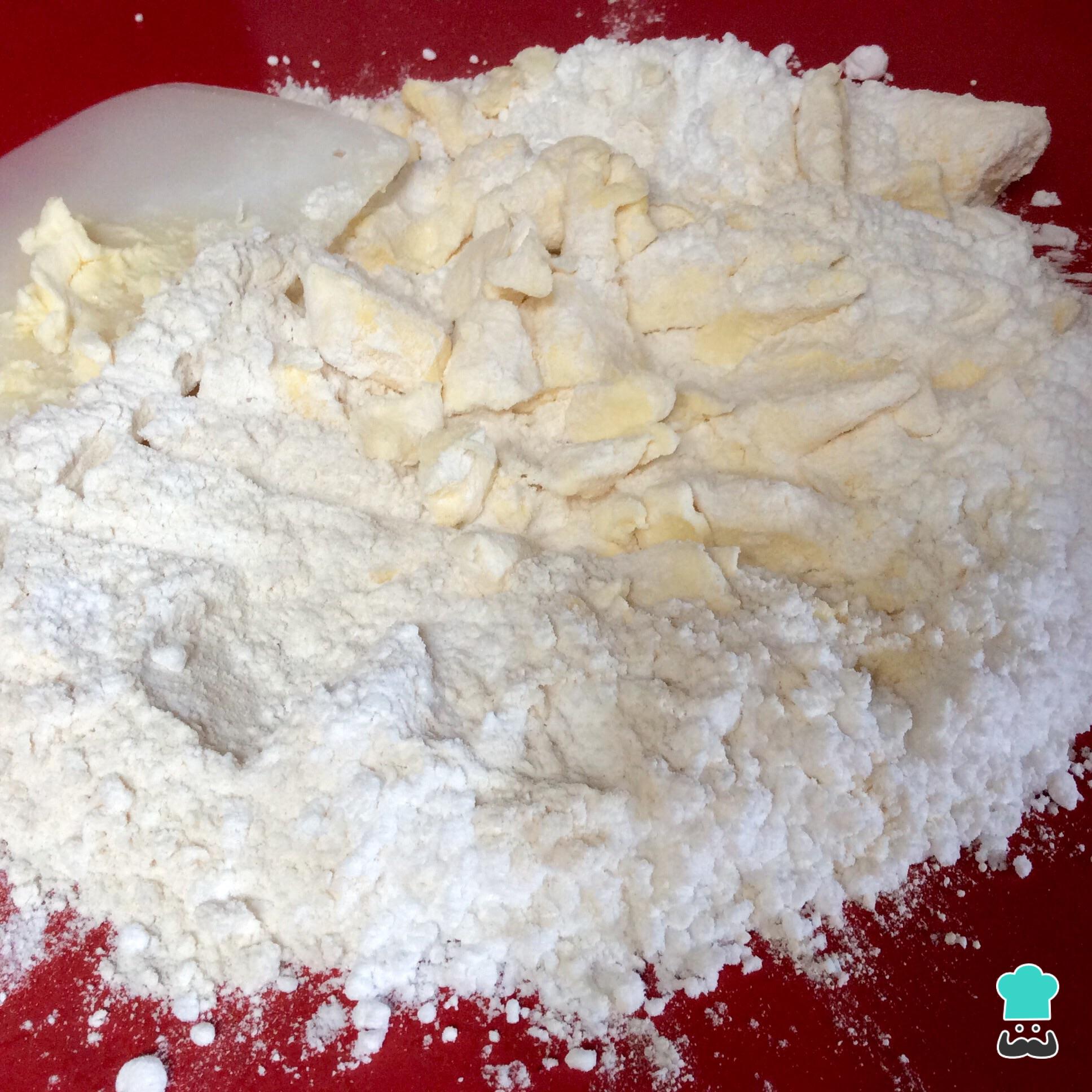 Comienza mezclando la harina junto con el azúcar pulverizado. Luego, coloca en el centro la mantequilla, pícala bien junto con estos ingredientes secos hasta obtener una arena.
