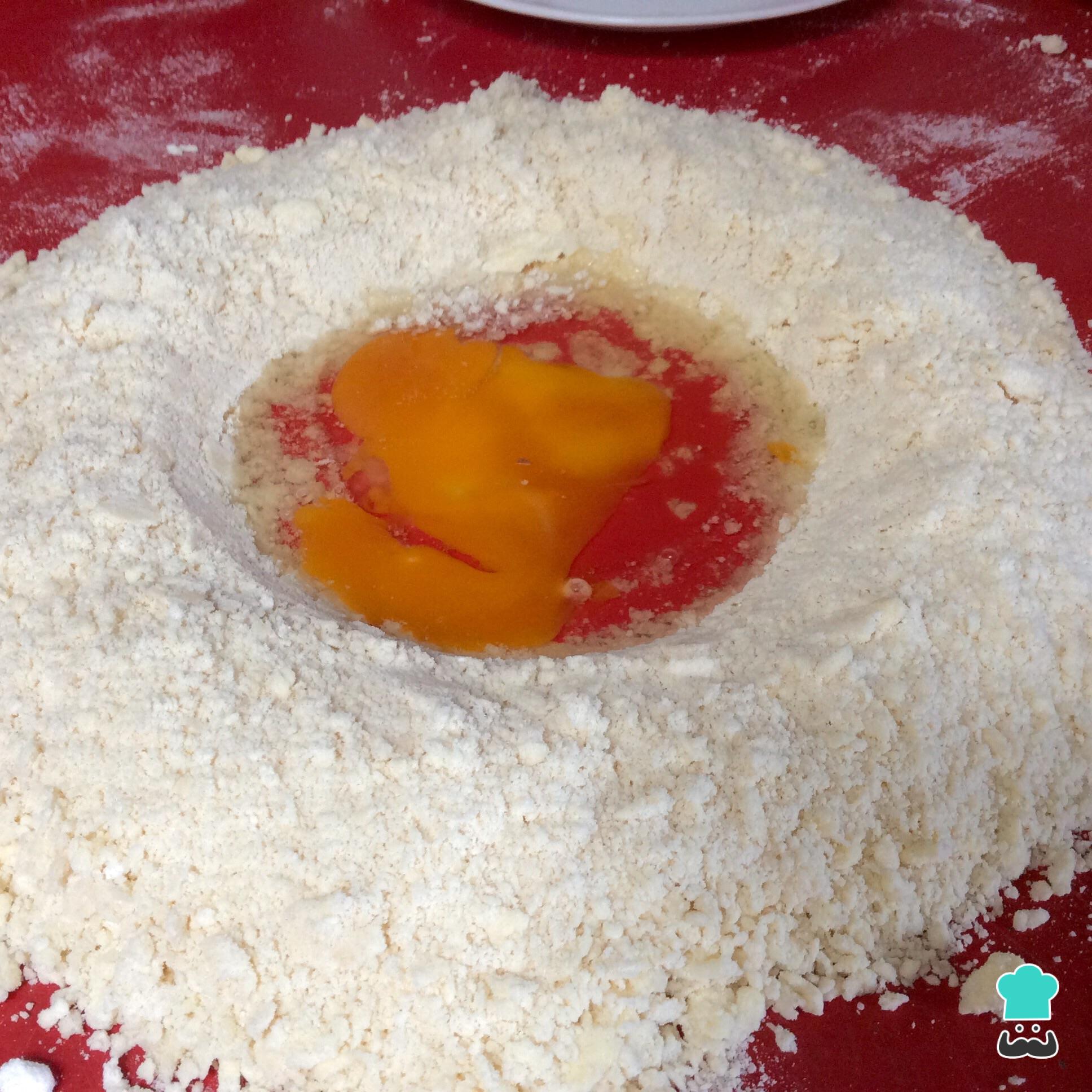 Cuando hayas obtenido la textura de arena, forma un volcán y agrega el huevo y un chorro de esencia de vainilla, mezcla hasta que quede una masa firme y homogénea. Deja reposar en la nevera 10 minutos.