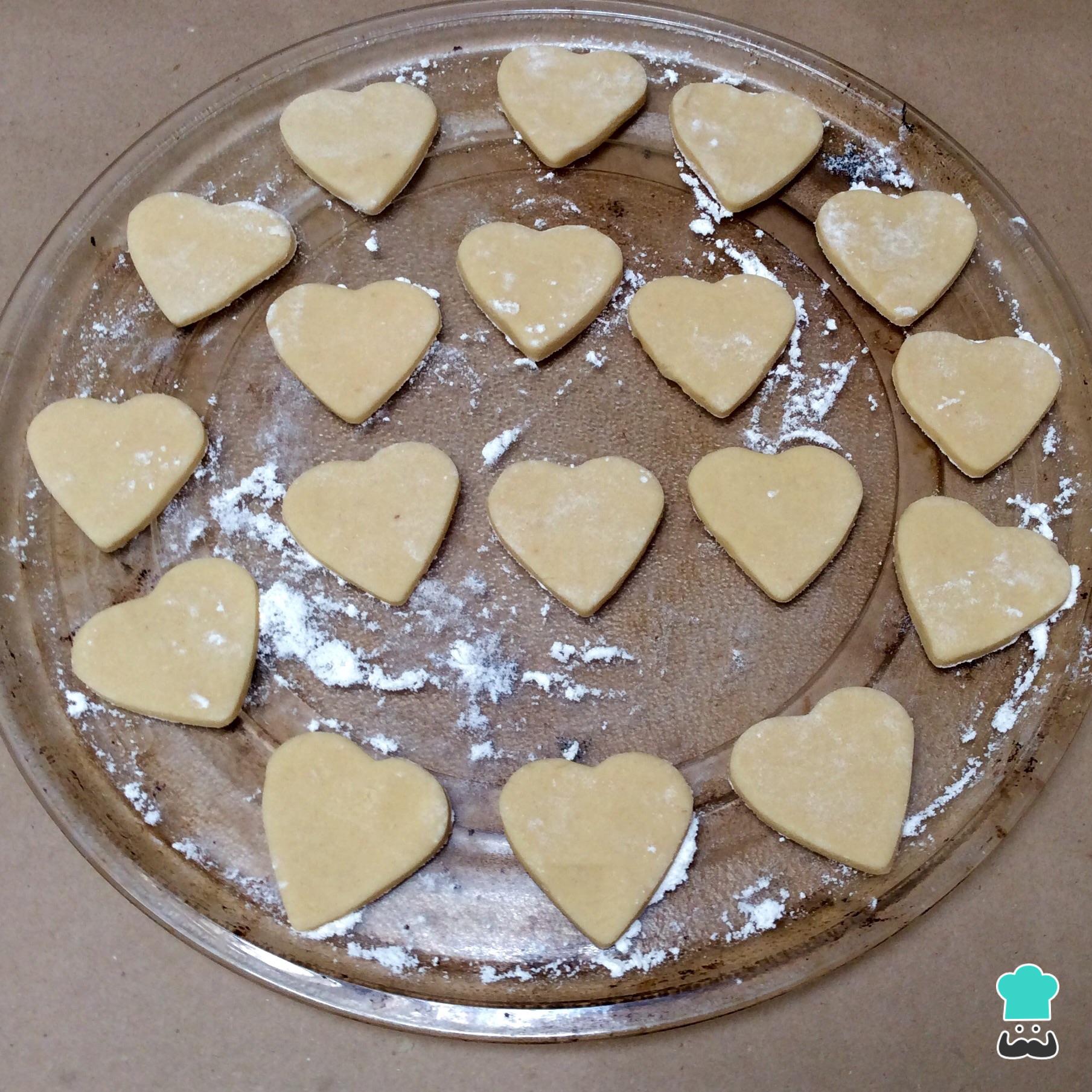 Pasados los 10 minutos, estira la masa y corta corazones del tamaño que desees, todas las galletas deben quedar del mismo tamaño para que se horneen parejas.