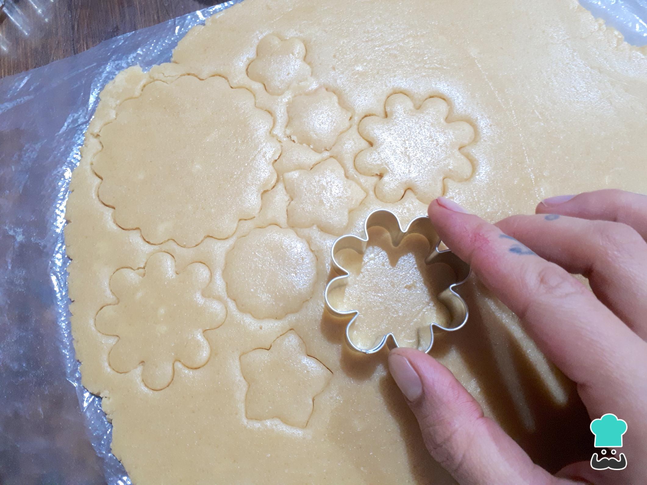 Prepara la masa, estírala y corta las galletas utilizando cortadores en forma de flor de distintos tamaños y figuras. Yo utilicé esta receta de galletas caseras de mantequilla compartida en RecetasGratis.