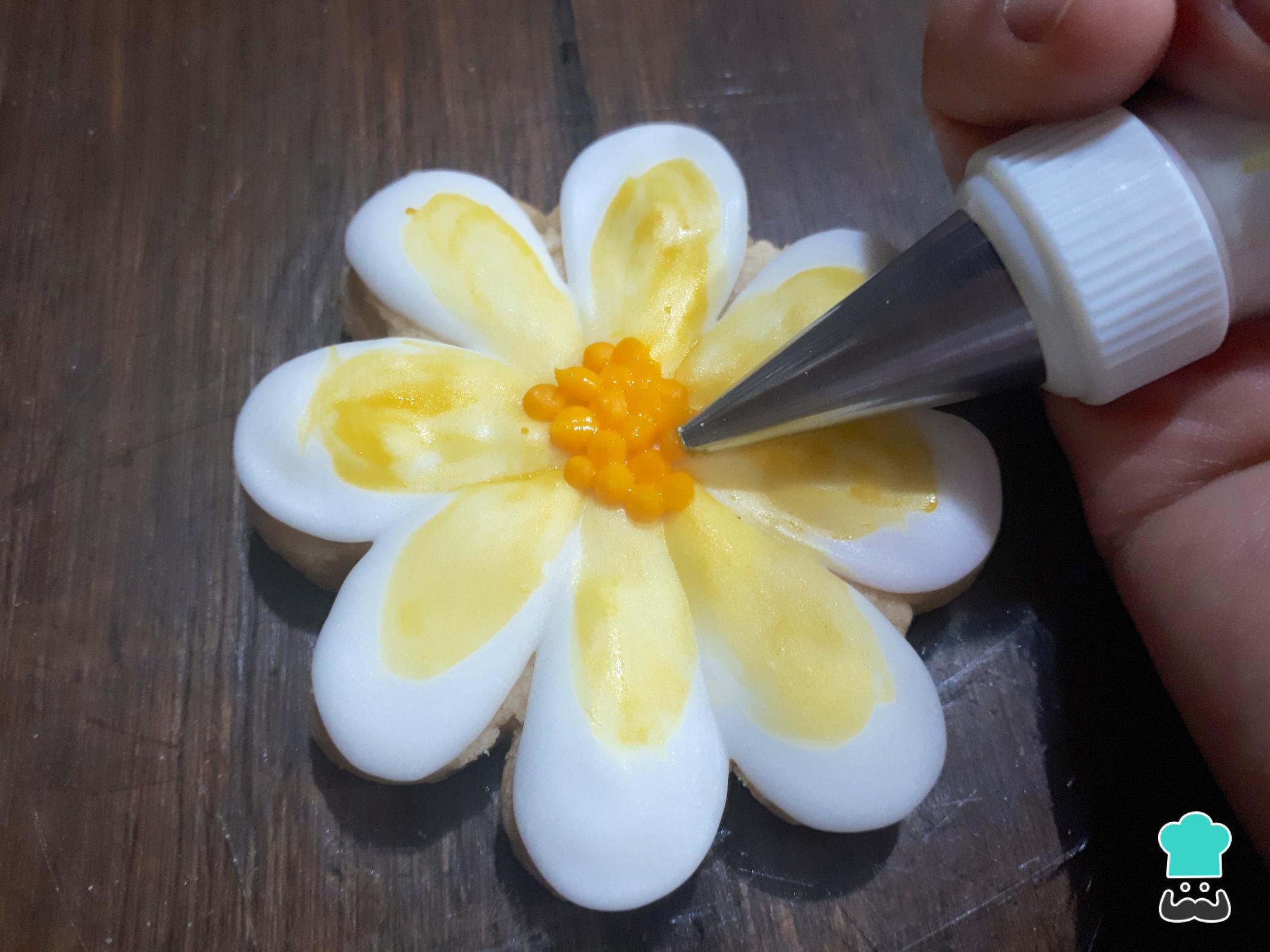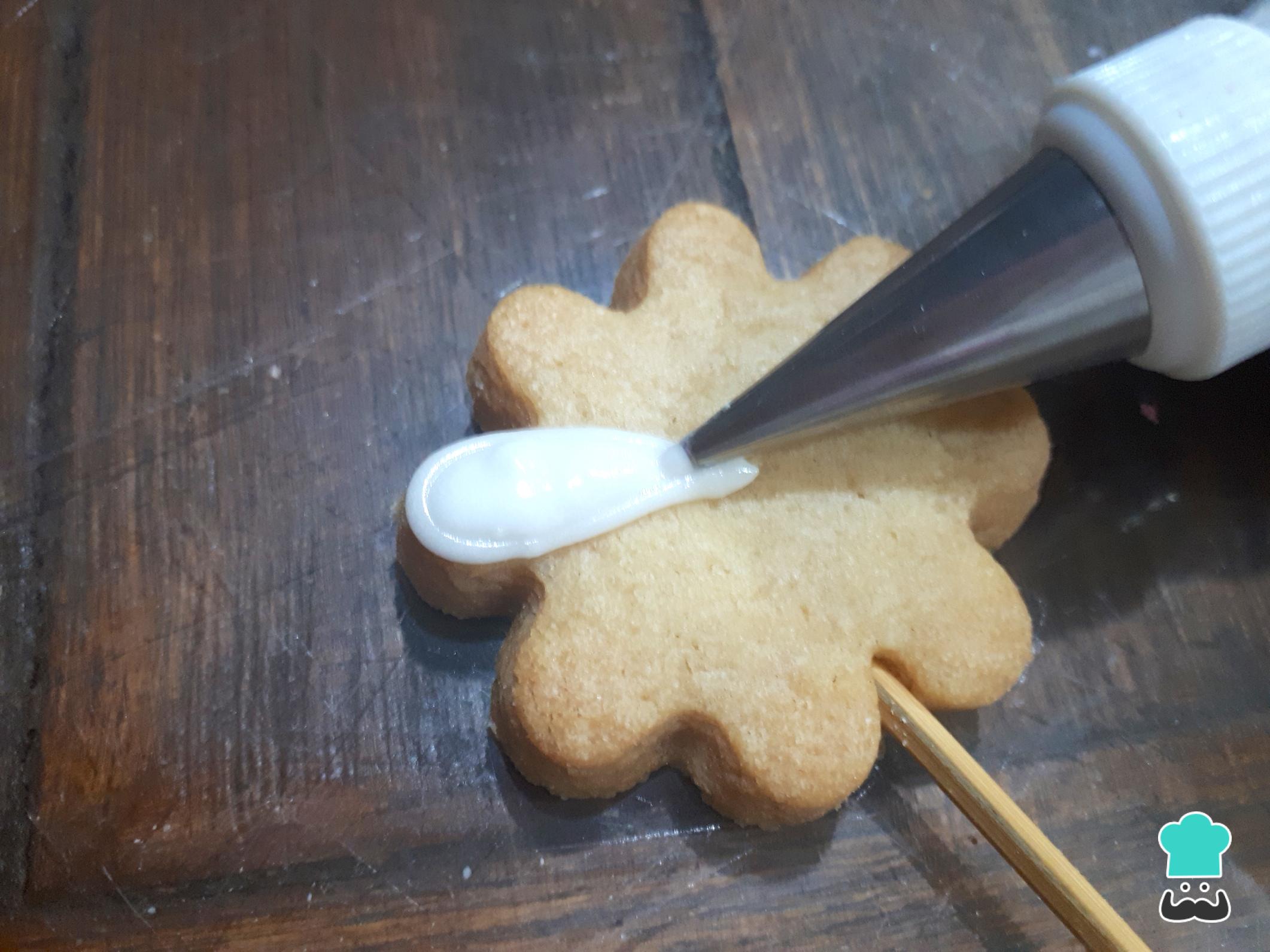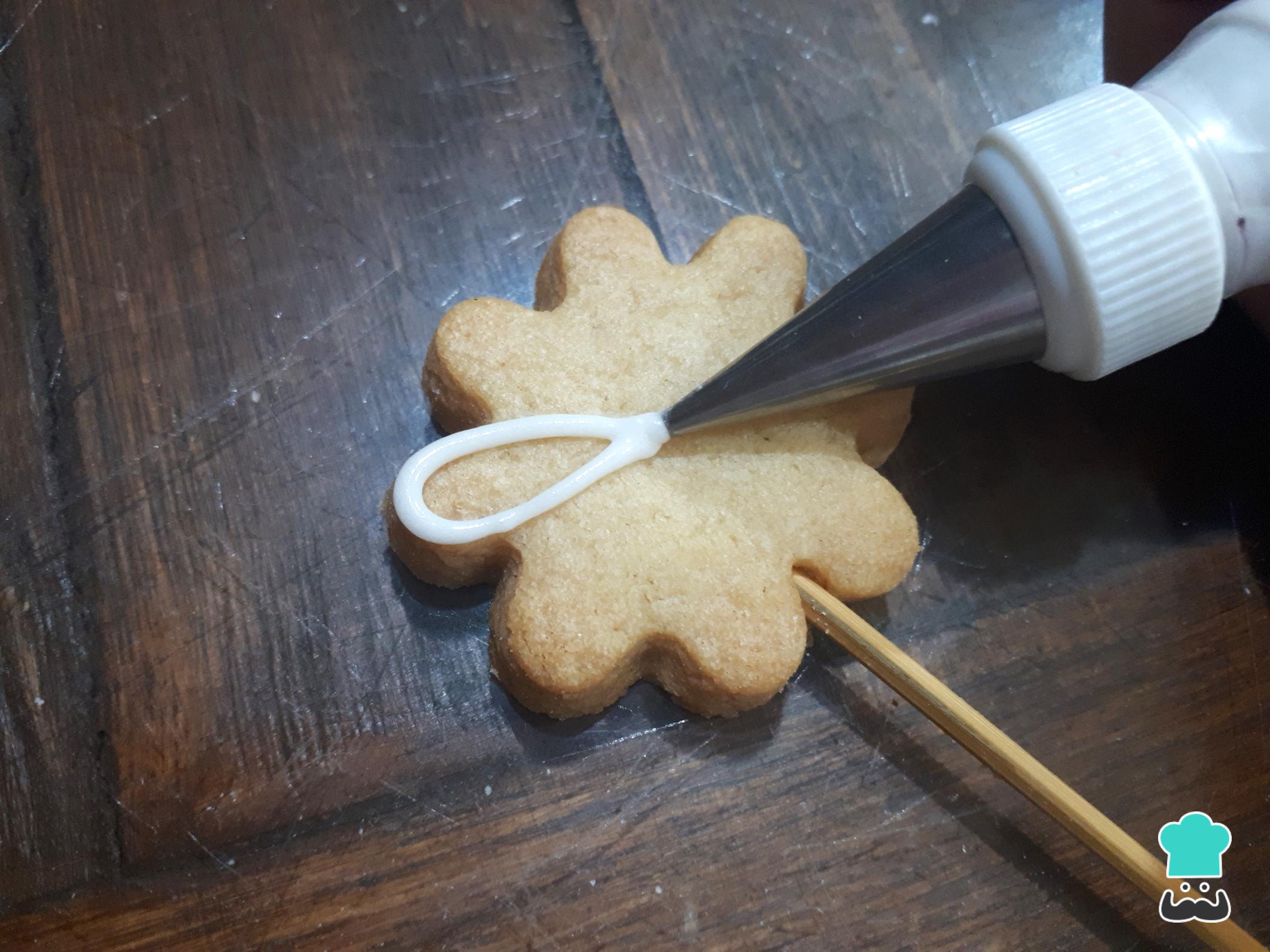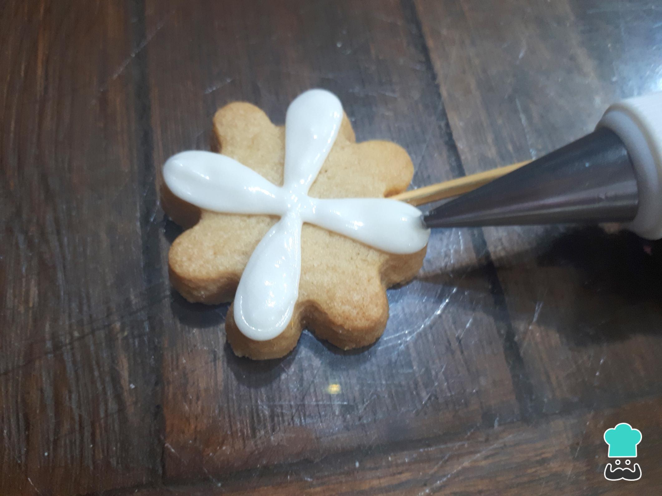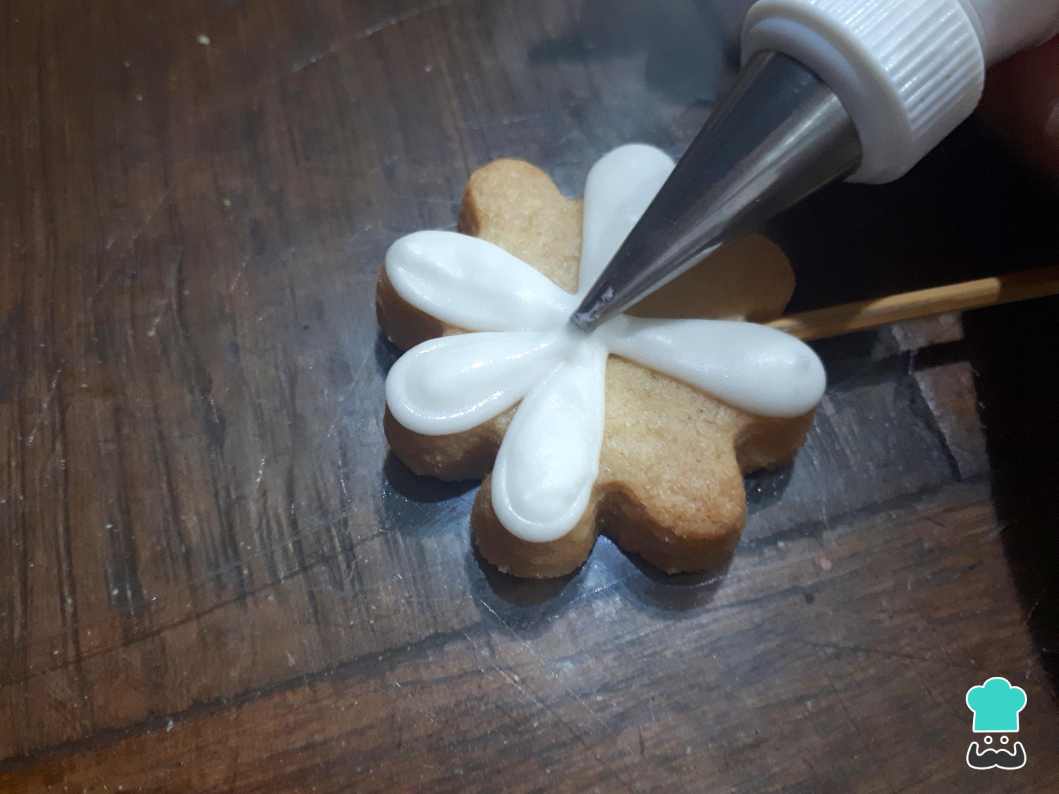 Una vez que las galletas se enfríen, sigue la forma de la flor y traza el borde de un pétalo con glasa real. Para saber cómo hacerla, no te pierdas la receta de glasa real, ¡es muy fácil!