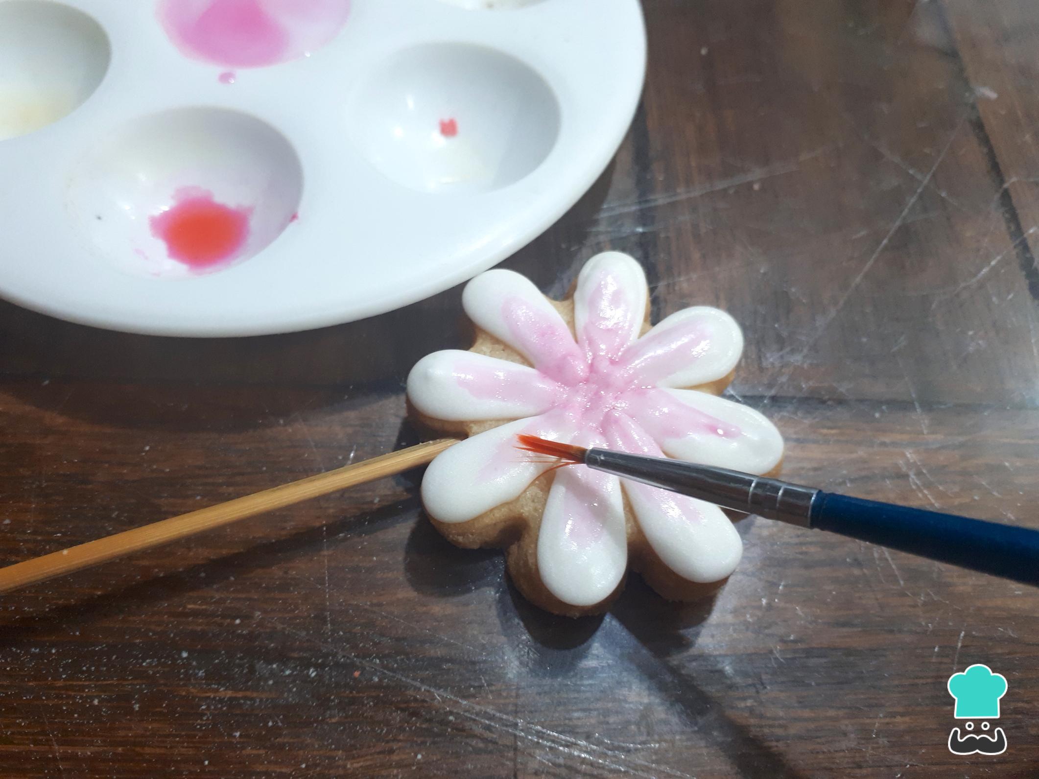 Repite el procedimiento alternando con un espacio entre cada pétalo, de esta manera evitaremos que los pétalos se peguen entre sí. Deja que las galletas decoradas del Día de la Madre se sequen por unos minutos antes de continuar.