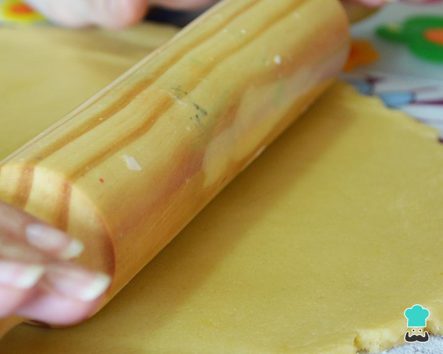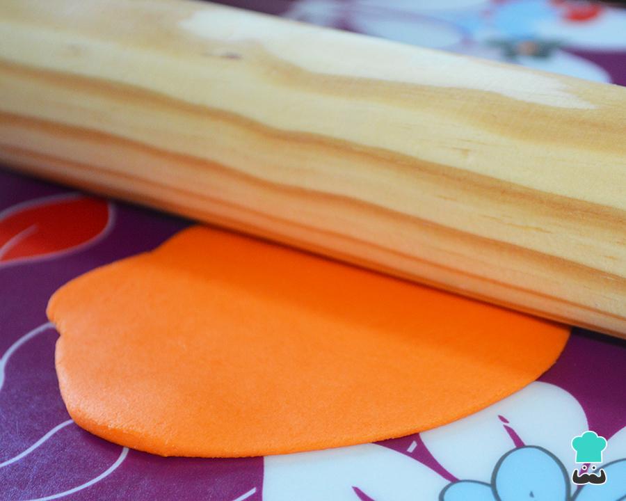 Si lo deseas, puedes utilizar galletas María en lugar de hacer las tuyas propias. Una vez horneadas, deja que se enfríen y extiende el fondant naranja con la ayuda de un rodillo. Si deseas preparar tu propio fondant, no te pierdas nuestra receta de fondant casero con nubes de azúcar, ¡es muy fácil! Luego, añade unas gotas de colorante naranja hasta adquirir el tono deseado.