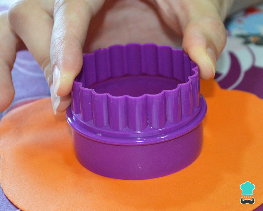Ahora, con un molde para galletas o la boca de un vaso corta círculos de fondant. Es importante que sean del mismo tamaño que las galletas, de manera que otro truco es colocar la galleta sobre la pasta de azúcar y usarla a modo de molde.
