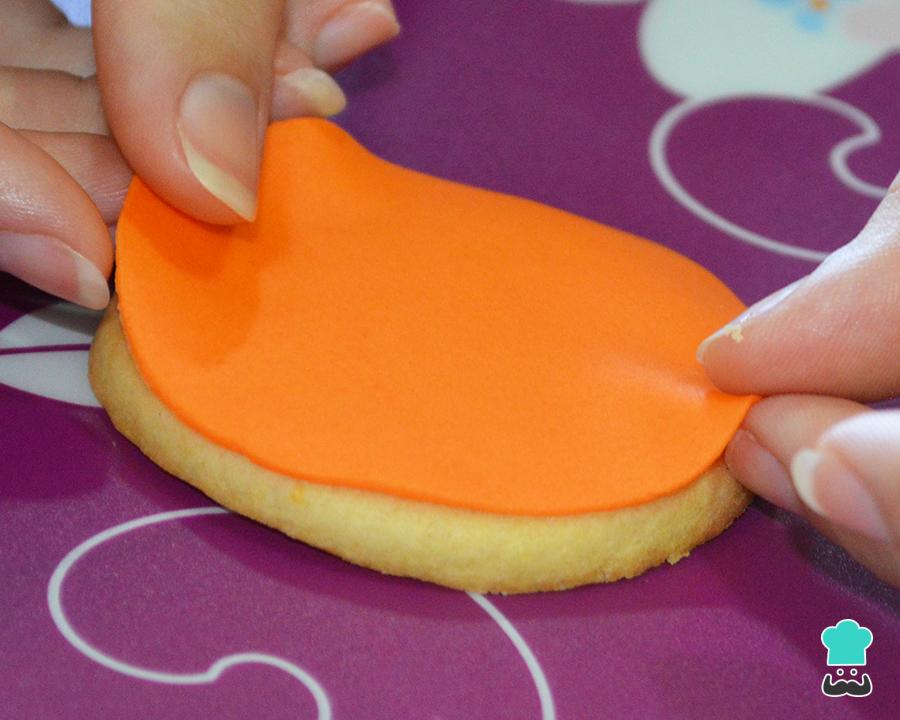 El círculo naranja será la base de la calabaza. Para pegarlo a la galleta, simplemente moja la yema de tus dedos en agua y da ligeros toquecitos sobre la galleta. Seguidamente, coloca el círculo de fondant y pégala bien también con la yema de tus dedos.
