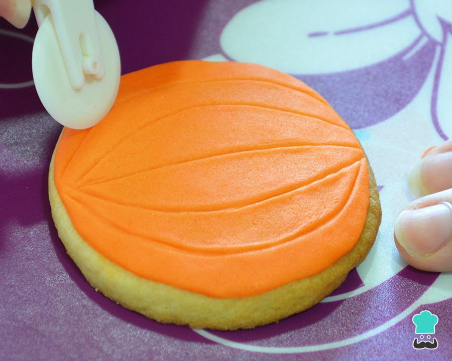 Ahora vamos a marcar las líneas de la calabaza. Para ello, coge un cuchillo de repostería o uno normal y dibuja líneas curvas que partan de uno de los puntos de la galleta. Si usas un cuchillo normal intenta no apretar para no cortar el fondant, puesto que lo que queremos es marcarlo no cortarlo.