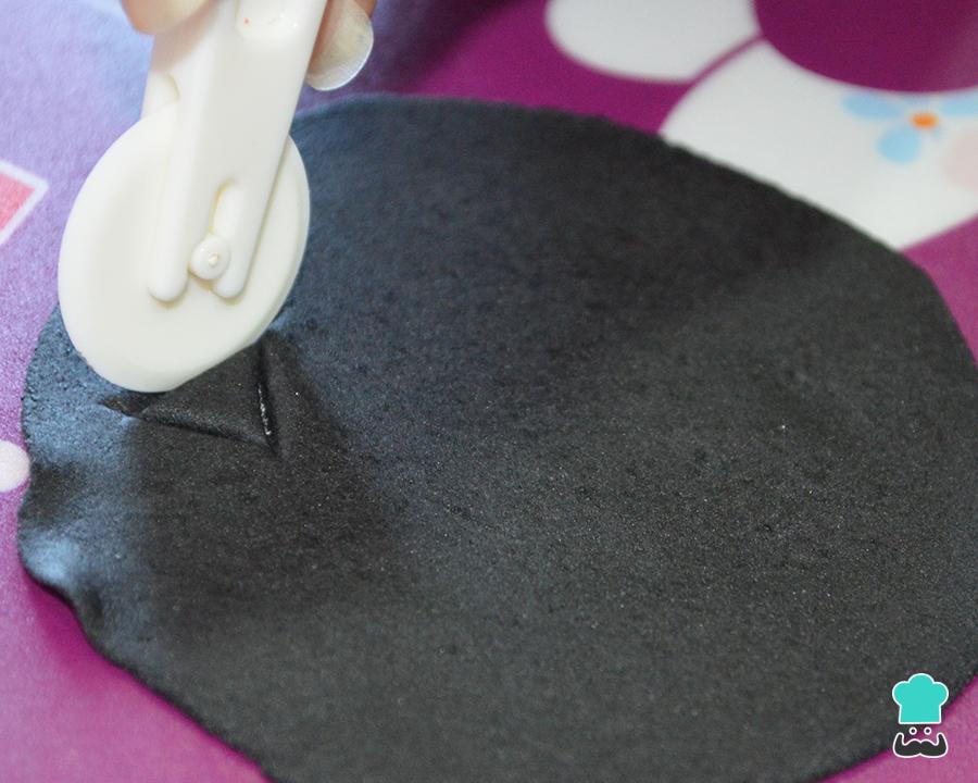 Hecho esto, vamos con la cara de la calabaza. Extiende el fondant negro y con el mismo cuchillo corta dos triángulos para los ojos, y la boca dibújala como tú prefieres, puedas hacerla más o menos terrorífica.