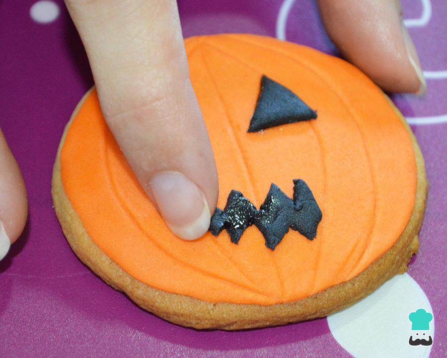 Para pegar los ojos y la boca a la galleta de calabaza deberás seguir el mismo proceso que con la base naranja, con agua. Eso sí, ten cuidado con la cantidad de agua que usas porque el fondant negro tiende a desteñirse y puede manchar el fondant naranja.