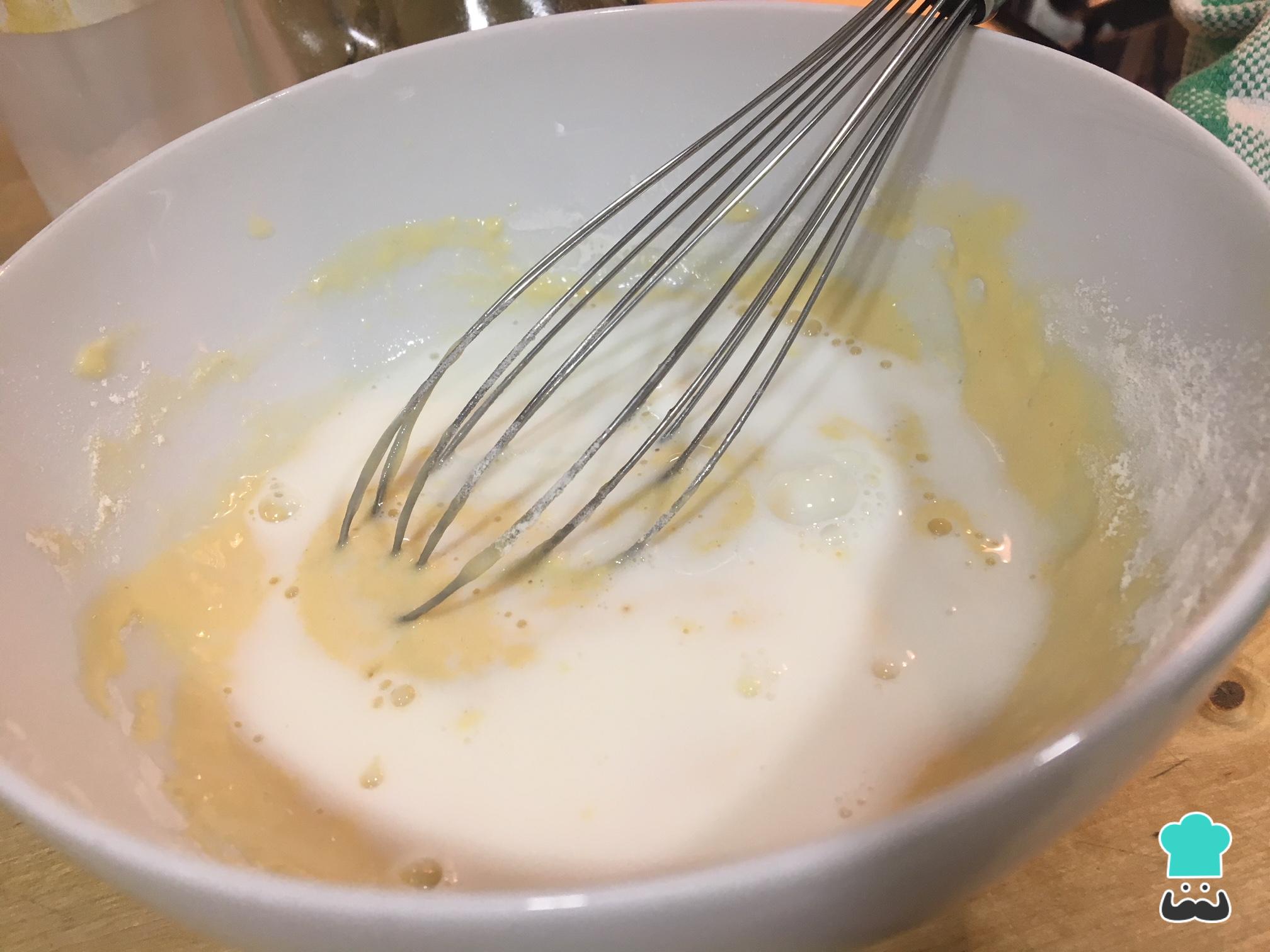 A continuación, agregamos la leche poco a poco para que se integre bien. Si el rebozado te queda muy líquido, puedes poner más harina, y si queda demasiado espeso puedes agregar un poquito más de leche.
