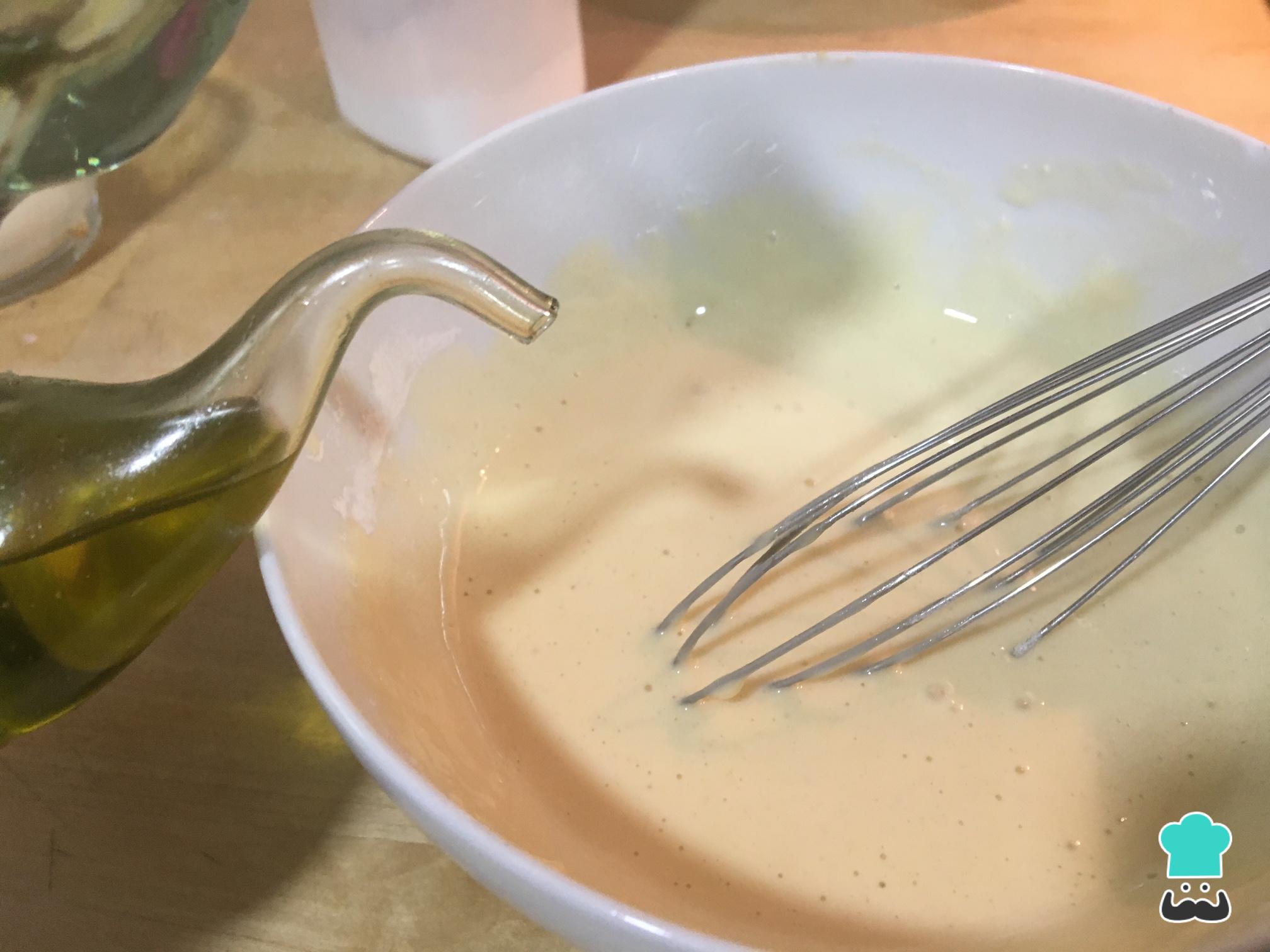 Ponemos una pizca de sal y una cucharada sopera de aceite de oliva. Seguimos mezclando bien con las varillas y dejamos reposar durante un par de minutos.
