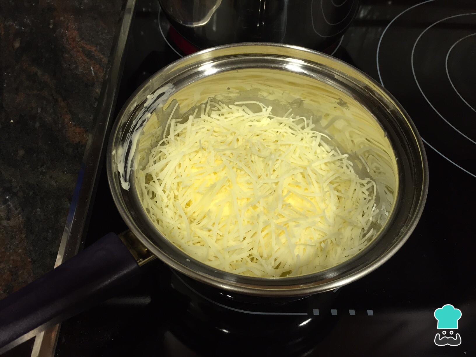 Cuando esté la mantequilla casi deshecha se añade el queso y se mezcla para que se deshaga también y quede todo hecho una masa.