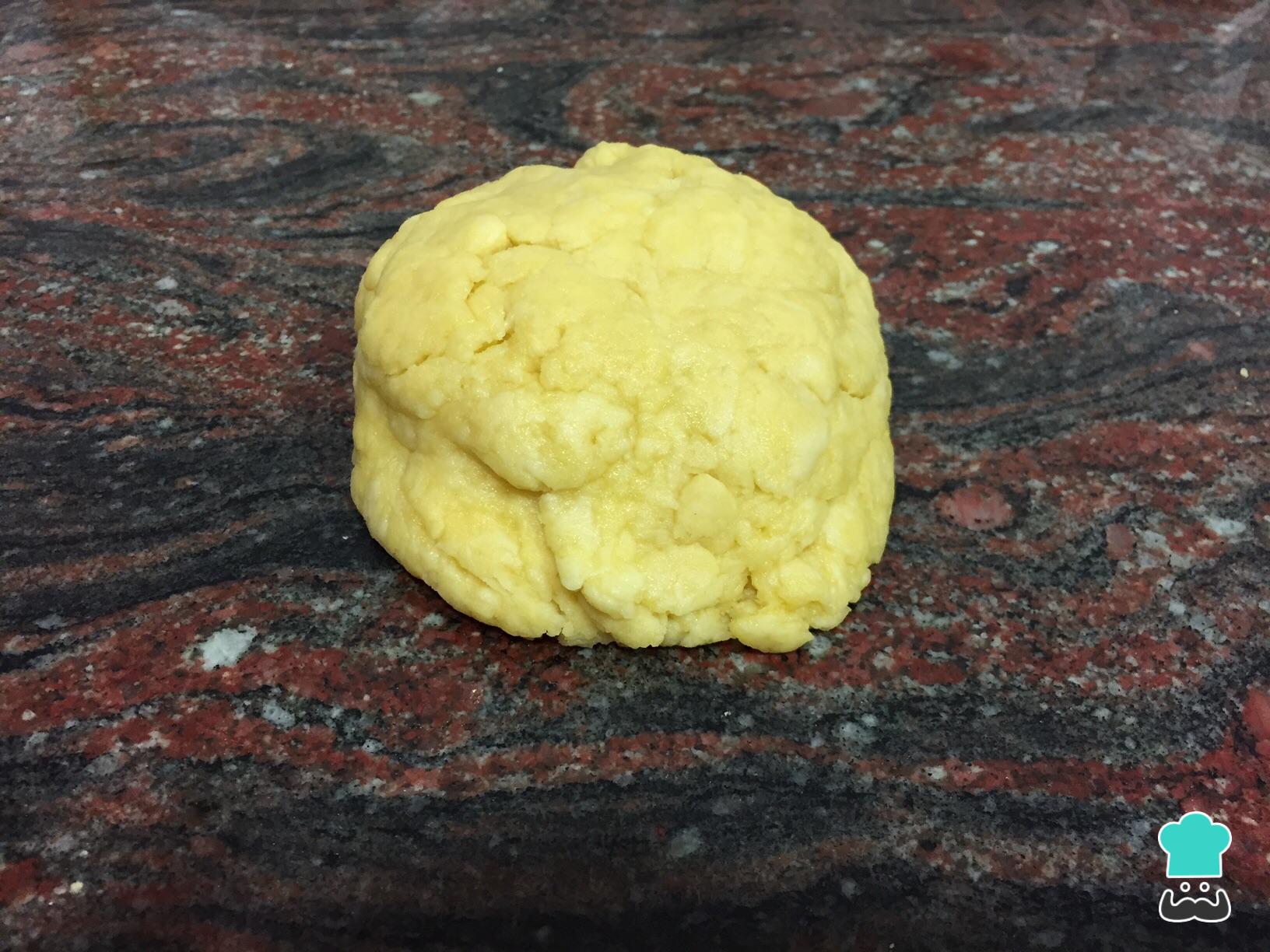 Dejamos templar y añadimos la harina. Luego mezclamos todo hasta hacer una bola como la que se observa en la fotografía. ¡Nuestras futuras galletas saladas!