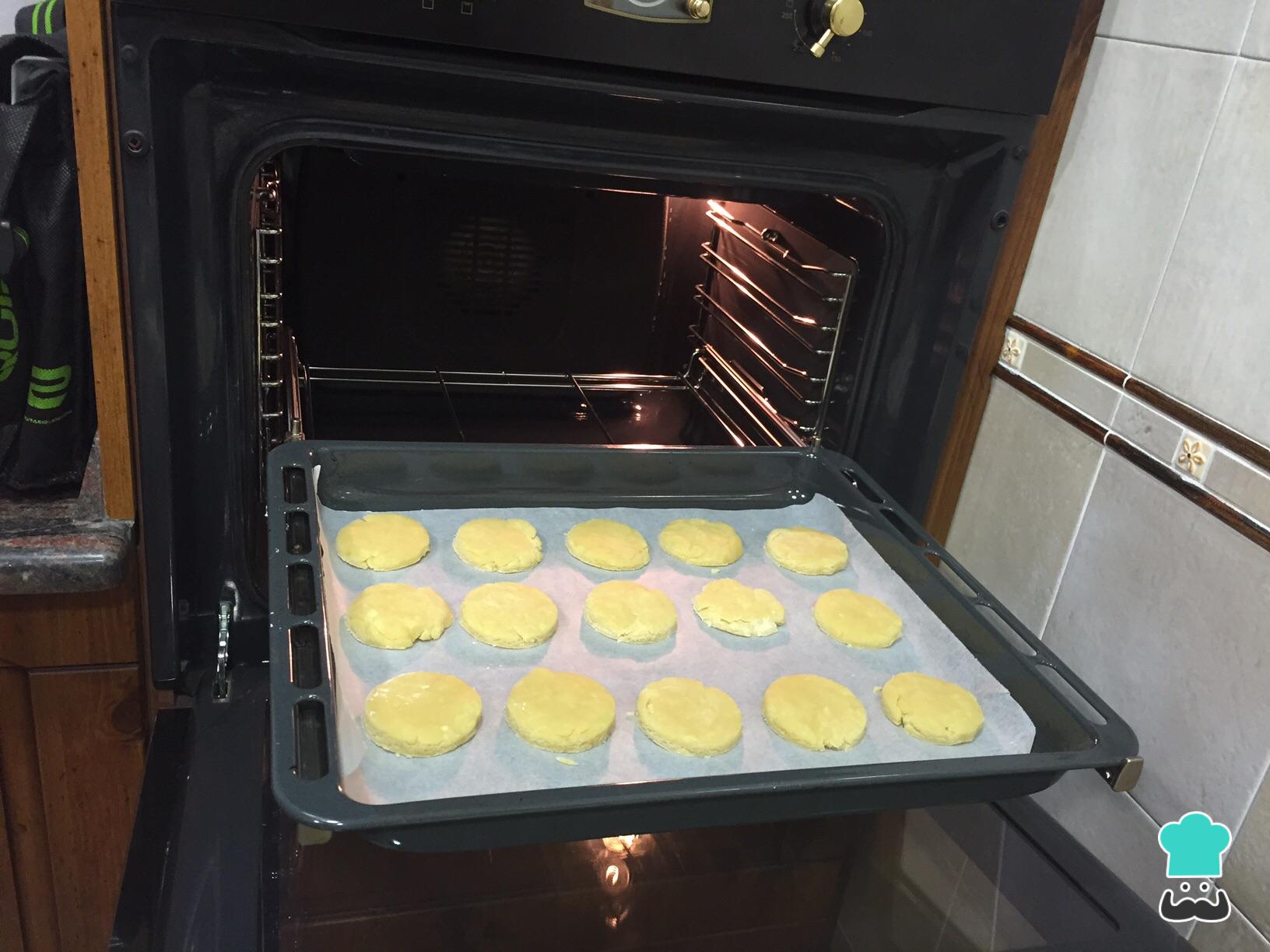 Amasamos y le damos forma de cilindro a la masa, que vamos a cortar en rodajas e ir colocando sobre el papel del horno. El horno estará precalentado a 180ºC y se pondrá a la misma temperatura para que las galletas se hagan hasta que se vean doradas, unos 20 minutos.