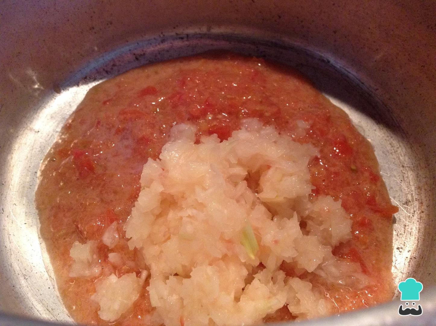 Lo primero será hacer el guiso básico para cocinar la carne desmechada. Para ello, licua o procesa los tomates junto con la cebolla ylleva el puré resultante a una olla a fuego medio con un poco de aceite de girasol. Deja sofreír durante algunos minutos.