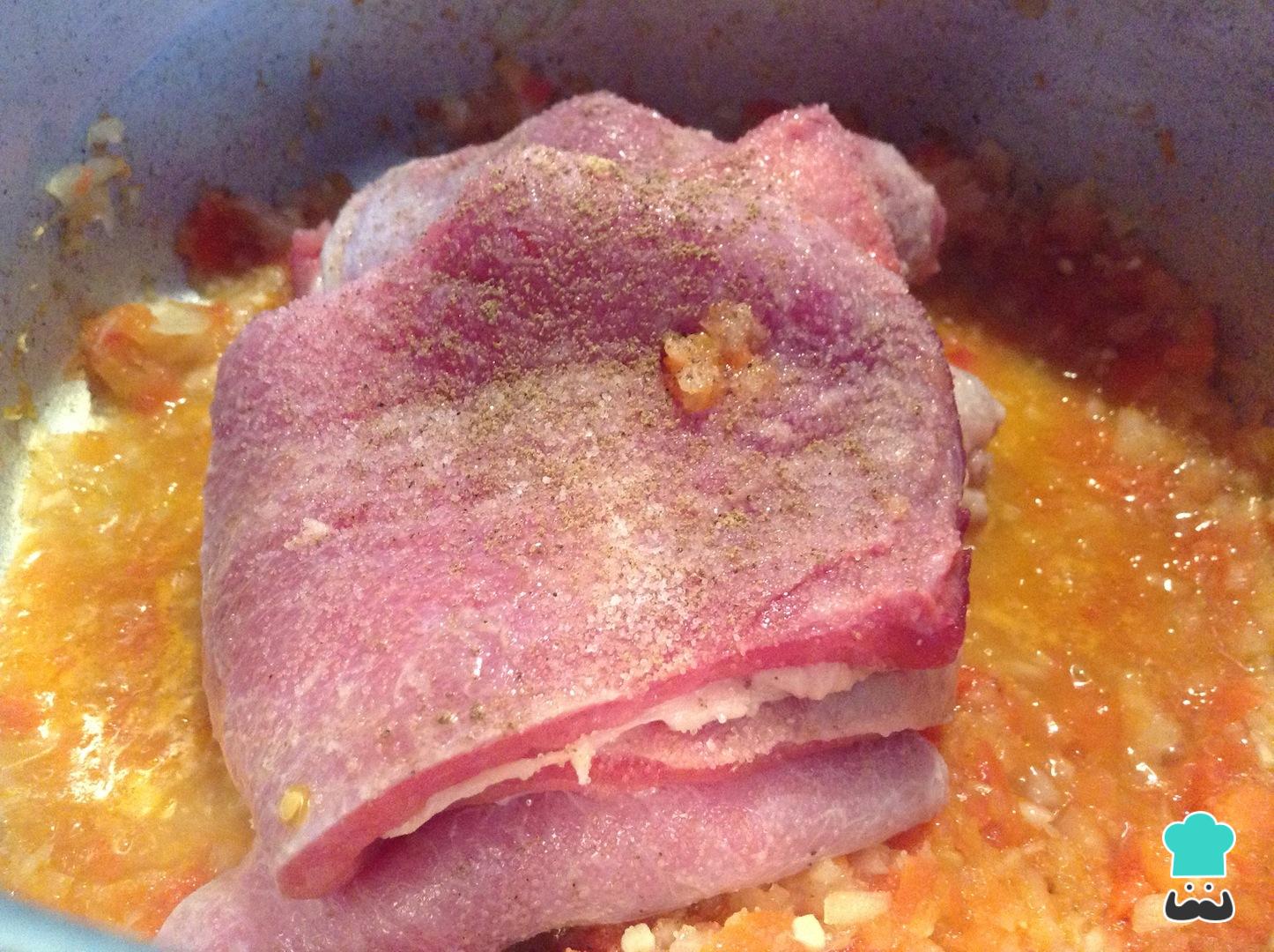 Cuando el guiso tome consistencia adiciona la pieza de carne, previamente cortada en trozos medianos, con un poco de sal, pimienta y ajo al gusto. Puedes agregar un poco de colorante y comino, lo que dará color y un sabor delicioso a la salsa.