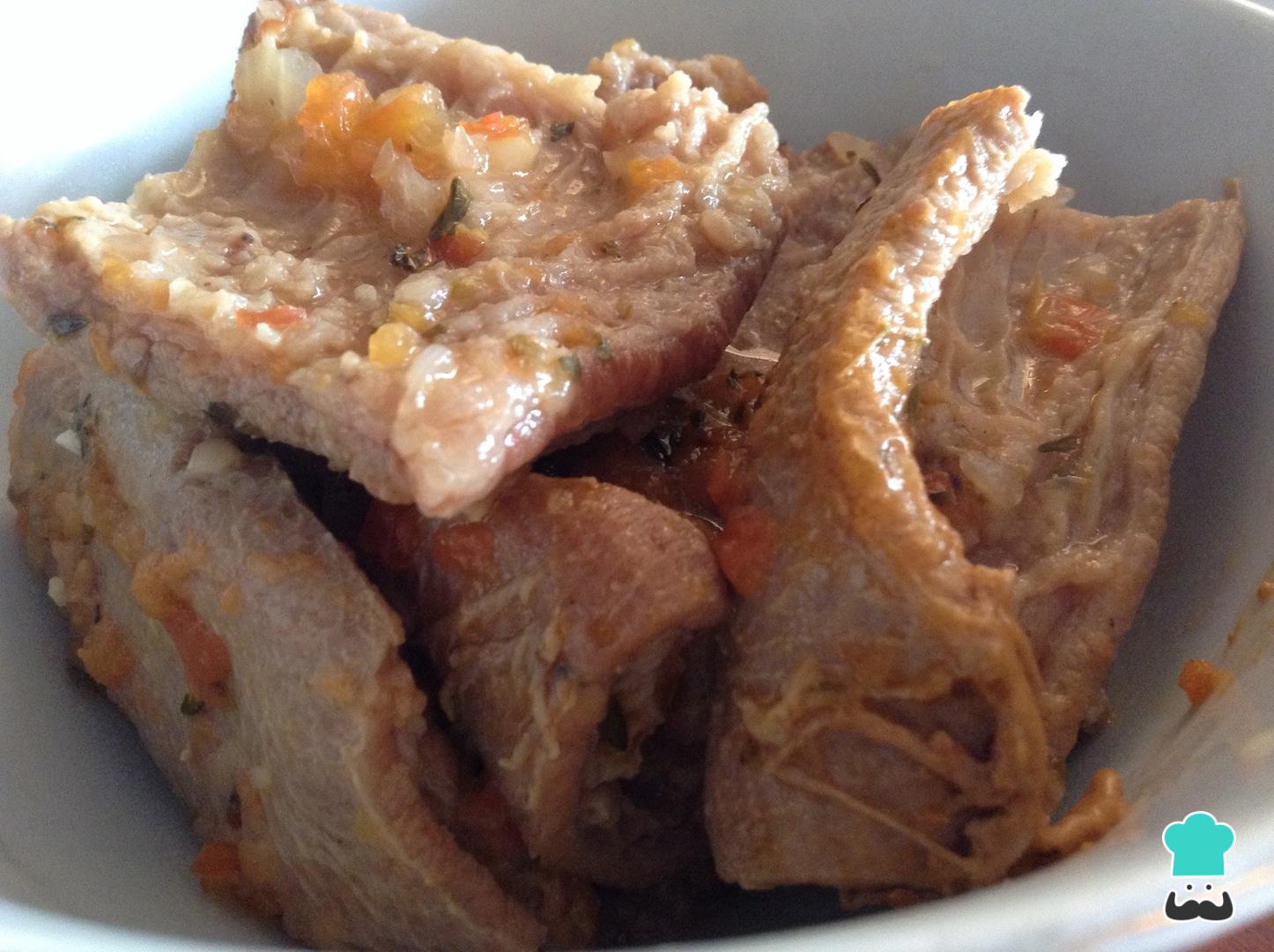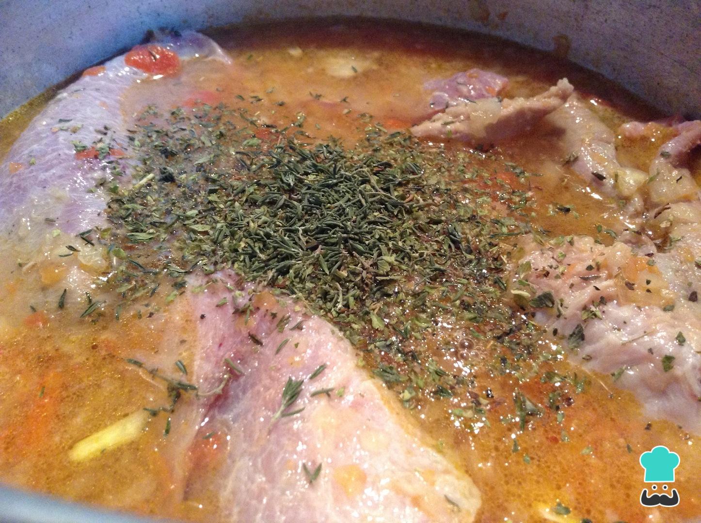 A continuación, cubre la carne con la cerveza, lo ideal es que la cocción se realice solo en este medio líquido pues va a tener mucho sabor. Agrega el tomillo, el laurel y tapa la olla a presión para que se cocine de forma más rápida. Como sugerencia, a mi me gusta que ésta quede muy blanda así que la cocino por una hora exacta para que obtener una carne tierna, jugosa y blanda.