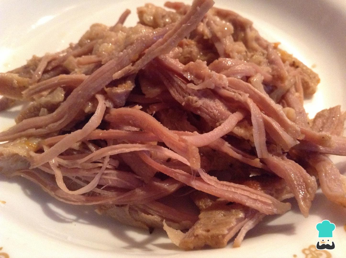 Una vez fría la carne podrás demecharla o deshebrarla con las manos. Empieza a desmenuzarla como se observa en la fotografía.