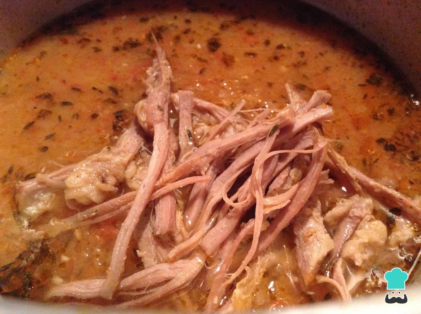 Una vez transcurra este tiempo retira la carne del caldo y deja enfriar. Reserva el caldo de la cocción.