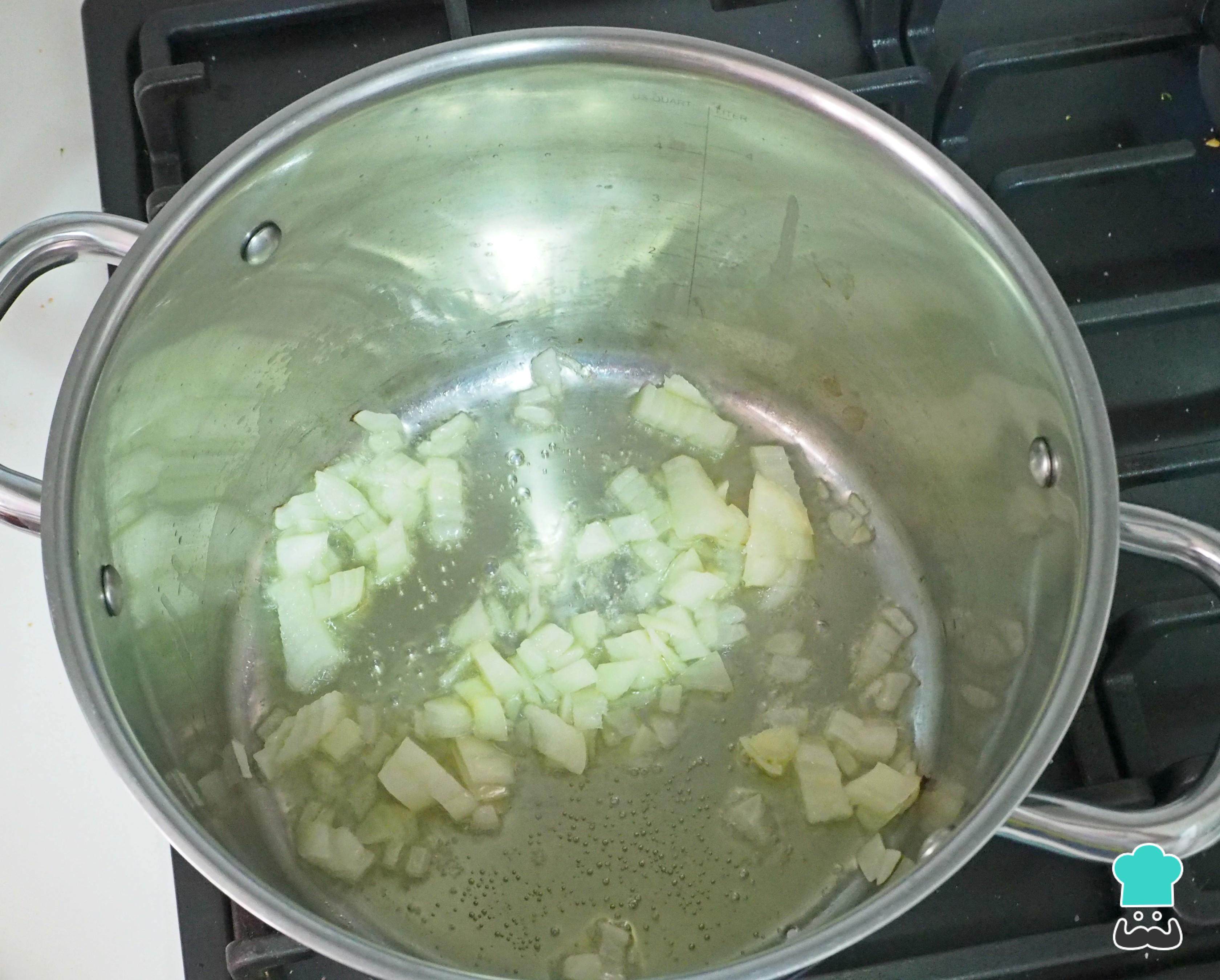 Empezamos la receta de garbanzos con chorizo y jamón dorando la cebolla, bien picada, con un poco de aceite en una cazuela.