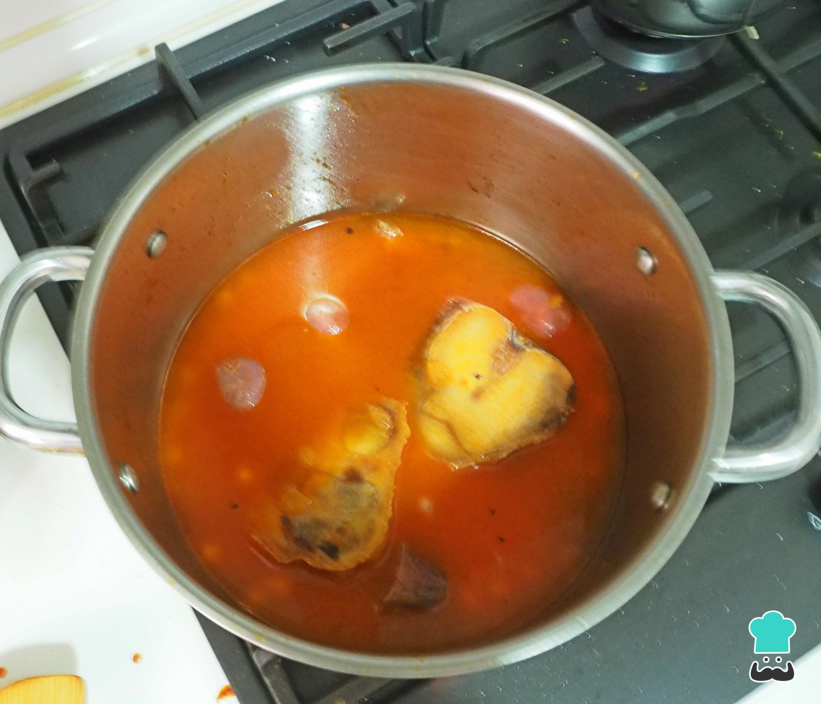 A continuación, añadimos un par de cucharadas de tomate, el chorizo, los huesos y el jamón, y removemos. Seguidamente incorporamos los garbanzos, que previamente habremos pasado por el chorro de agua y escurrido bien. Removemos, cubrimos con agua y subimos el fuego hasta que empiece a hervir. Entonces, dejamos hervir durante unos 15 minutos o hasta que se haya consumido parte del líquido y nos quede una consistencia a nuestro gusto. Como veis no he echado sal, puesto que el chorizo y el jamón ya llevan bastante. Si queréis echar un poco hacedlo con cuidado para no pasaros.