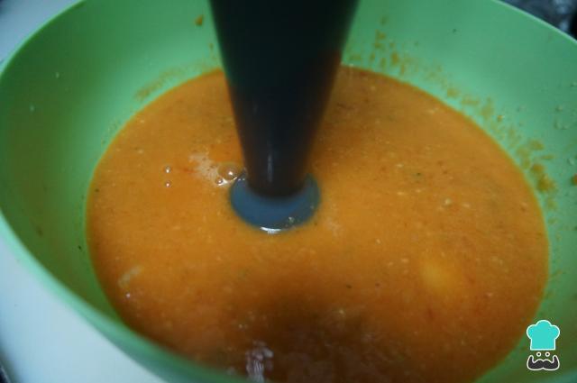 Ya están listos los ingredientes para triturarlos. Asimismo, para que sea más fácil añade un vaso de agua fría y tritura hasta que quede toda la mezcla sin grumos. Si tienes un robot de cocina puedes triturar todo, ya que quedará la crema más fina.