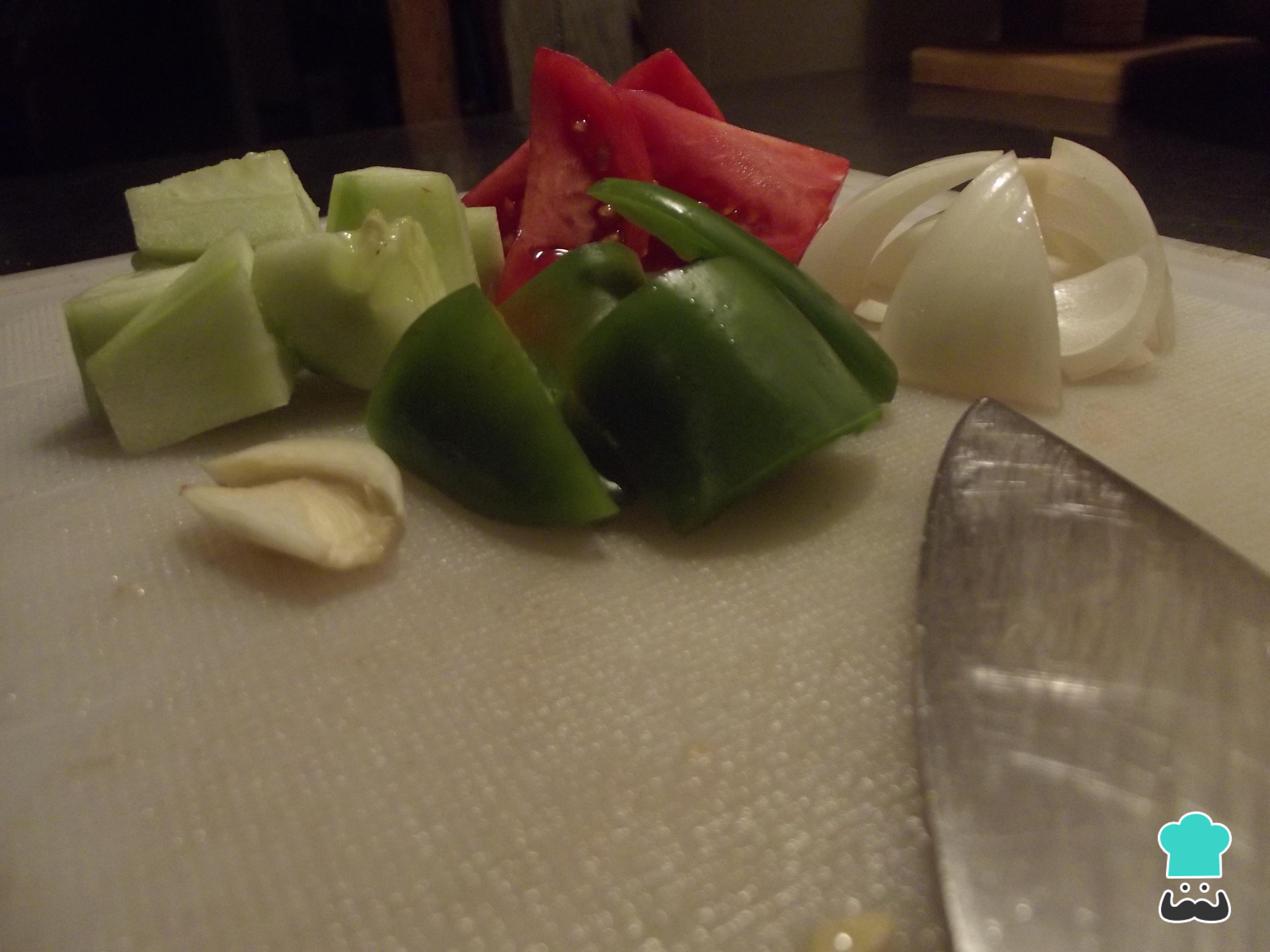 Prepara los ingredientes. Para ello, pelar y cortar en cuartos los tomates. El pimiento, retirar las semillas y la base para trocearlo en cuadros medianos. También cortar la cebolla en cuadros medianos y pelar y cortar de la misma forma el pepino. El ajo quitarle el germen del medio o la parte verde. Reserva un trozo de pepino para la decoración final.