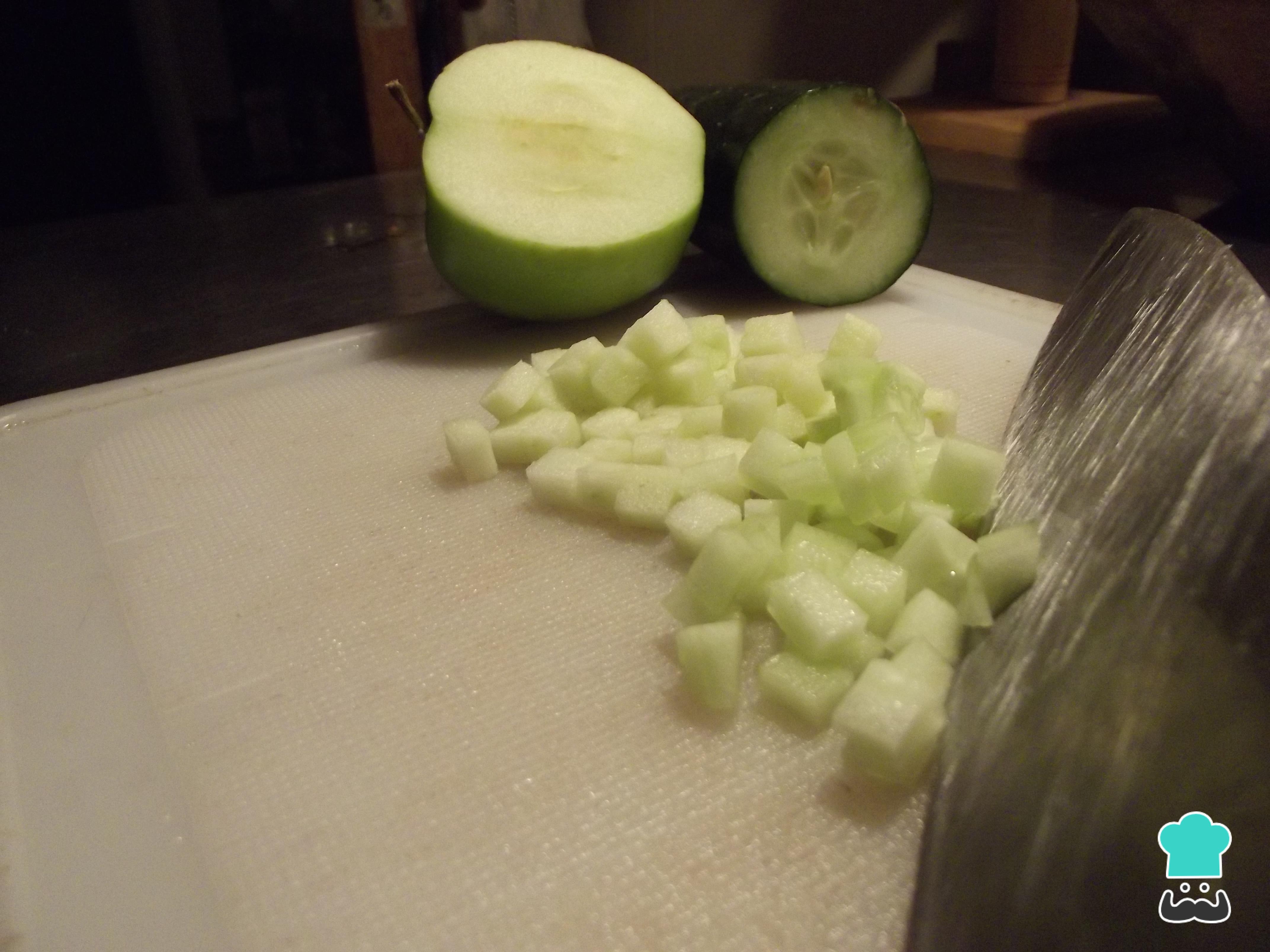 Cortamos el pepino reservado en cubos pequeños y hacemos igual con la manzana.