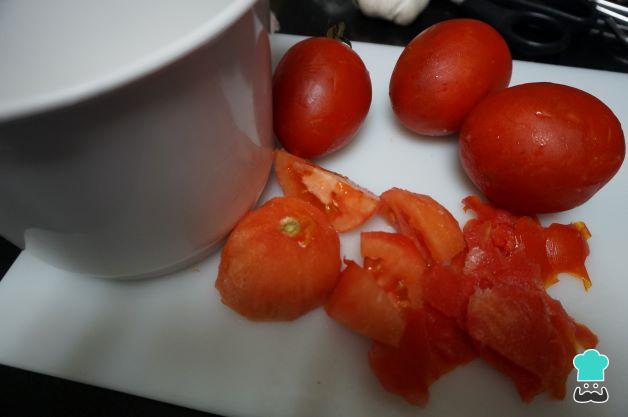Para hacer el gazpacho de sandía y manzana, primero prepara los tomates, pélalos y córtalos en trozos. Ve poniendo los ingredientes en un vaso batidor o en un robot para triturar.