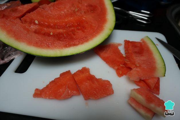 Corta la sandía, retira la piel y las pepitas, trocea y ve añadiendo los trozos junto con los tomates.